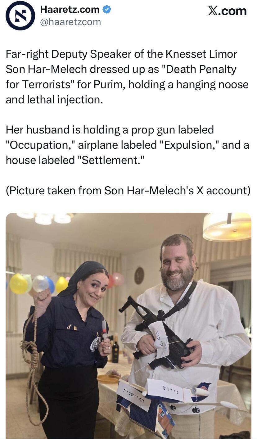 Le quotidien israélien Haaretz a partagé une photo sur les réseaux de la vice-présidente d’extrême droite de la Knesset, Limor Son Har-Melech, qui s’est déguisée en « Peine de mort pour terroristes » pour Pourim, brandissant une corde et une seringue létale.