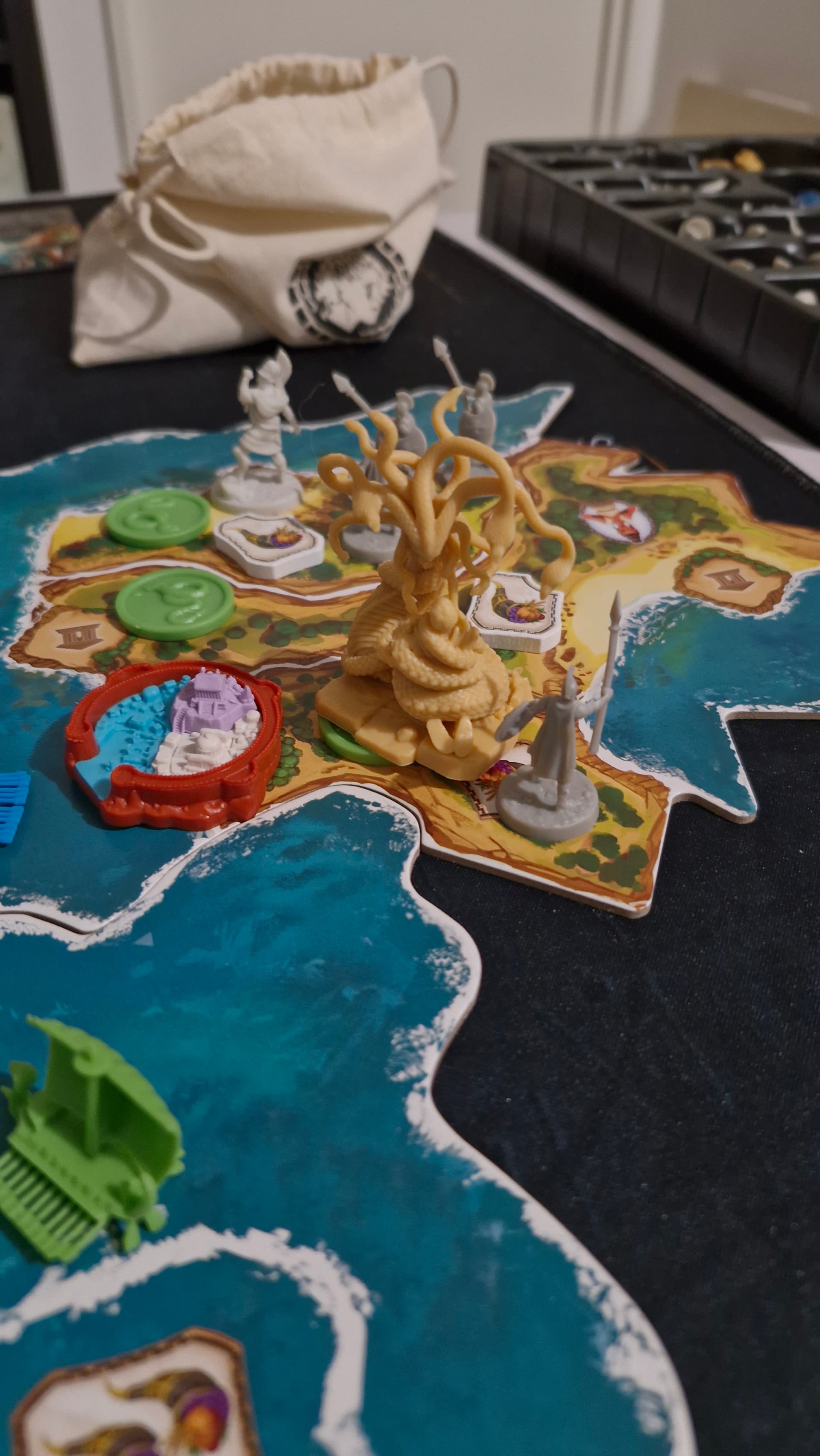 Et désolé pour ta sacoche, entre ça, les figurines tordues, celles qui ont leur bras qui tombent, ou le centaure qui lui manque un morceau, le héros en double qui a pris la place d’un autre héros, l’unité d’une faction manquante, une tuile de dieu mal imprimée… Ça commence quand même à faire beaucoup.