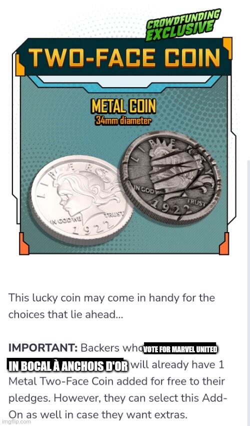 Tiens c’est marrant la news où ils annoncent qu’une pièce métal double face est offerte à chaque personne qui a voté pour Marvel United dans le Bocal à Anchois d’Or (groupe 31).