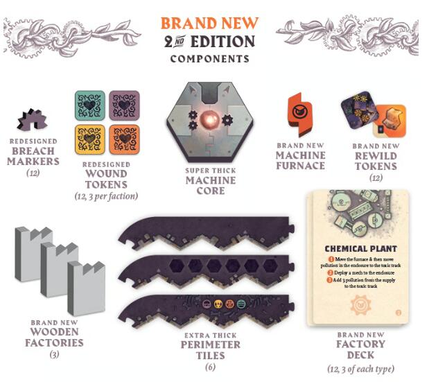 Matériel amélioré : Composants en bois, tuiles de bordure plus épaisses, nouveaux jetons de dégâts et de brèche, et ajout d’un livret d’univers (Lore).