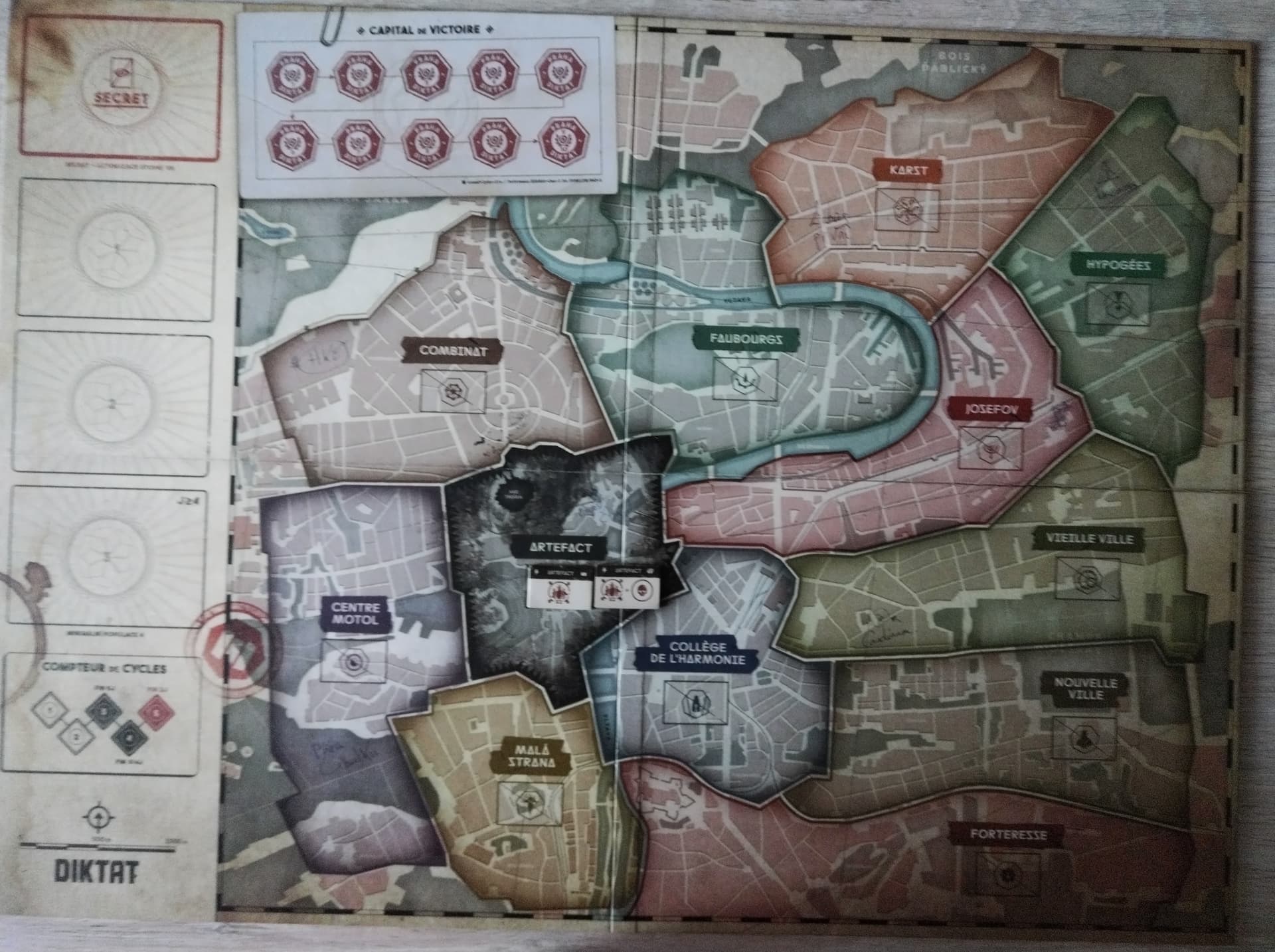 L’asymétrie des Cabales est un autre des points fort de Diktat. Aucune n’a un gameplay qui se ressemble et plus vous la développerez via des cartes propres à chacune, plus vous accenturez votre asymétrie et votre pouvoir de casser les noisettes aux autres (et là je me rends compte que j’ai oublié de prendre des photos des cartes développement