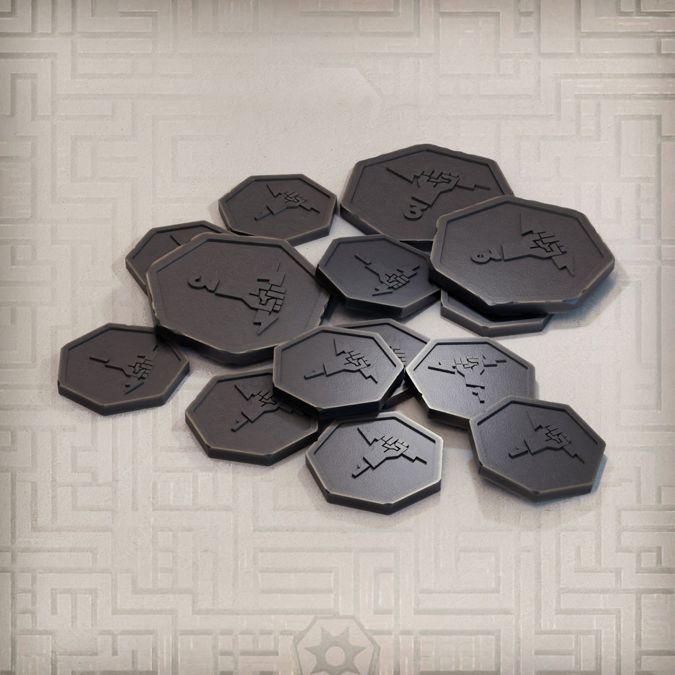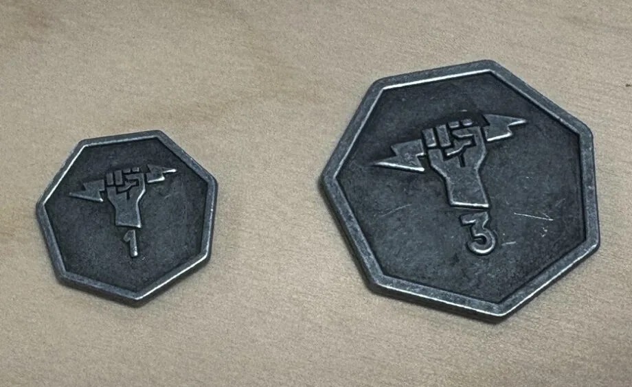 Les pions des factions de la préproduction paraissent également assez brillants, alors que la campagne présentaient des visuels de pions mats (et comme un peu granuleux), qui s’accordaient mieux avec l’univers sombre de Diktat.