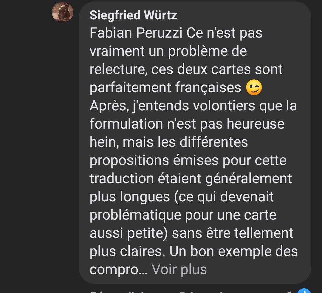 Mais honnêtement quand tu as des licences aussi prestigieuses, tu fais relire ce genre de carte. Ce sont des jeux d’optimisation, chaque mot est important. C’est pas une salade de cafard ou un 7w architect ou l’iconographie se suffit à elle même. On pinaille sur les mots donc chaque problème de syntaxe ou erreur de trad pollue la fluidité du jeu