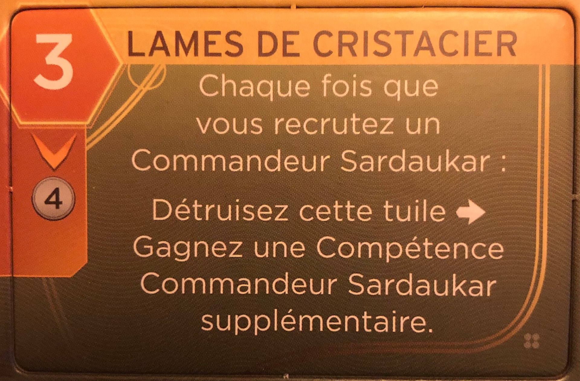 Pour les lames de cristacier : on n’avait pas compris le mot « recruter », on avait confondu avec « acquérir », du coup il semblerait que ça marche même si on recrute un de ses Commandeurs Sardaukar de sa réserve (qu’on a dc déjà acquis auparavant)? Par contre on a compris que ça fonctionnait qu’une fois, mais bon on pensait que la tuile devenait inutile si tous les commandeurs avaient été déjà acquis par les joueus…