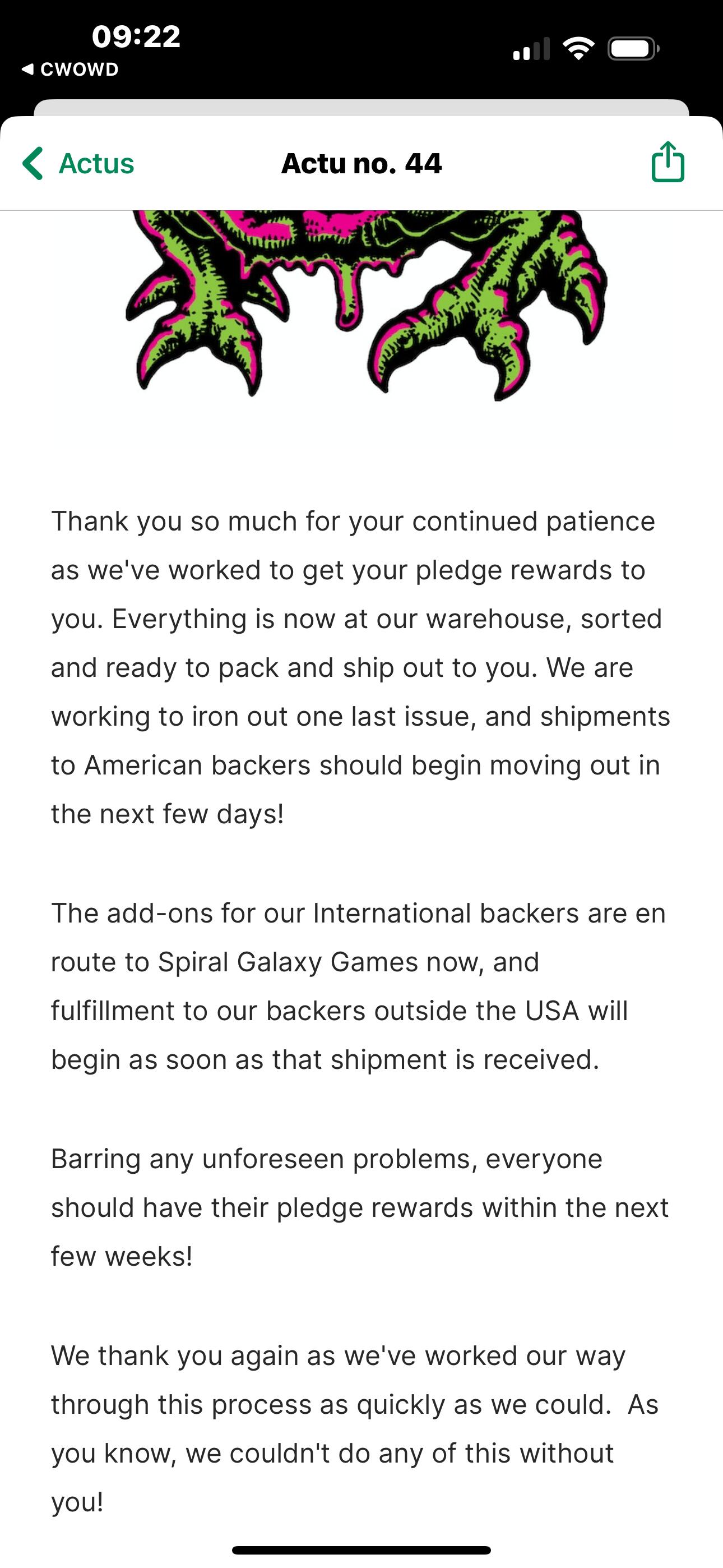 Spiral Galaxy a confirmé etre en charge du dispatch pour l’europe et leur derniere publication facebook du 19/01 parle bien de Dungeon Degenerates dans les envois a venir. ![]()