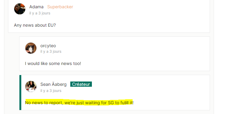 Oui, malheureusement il semble que semaine apres semaiine ca soit toujours repoussé chez spiral galaxy… Donc je sais pas ou il est ce mec dans le monde mais pour EU c’est toujours en attente.