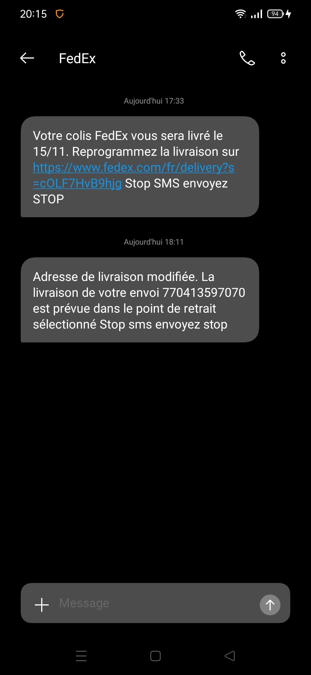 FedEx prévoit de me le livrer le 15/11. Je vous rassure , vous pouvez changer l’adresse sur le site de FedEx avec le lien qu’il vous donne.