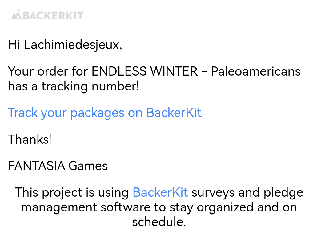 J’ai reçu aussi un mail de Backerkit pour dire que ma commande a un tracking FEDEX…
