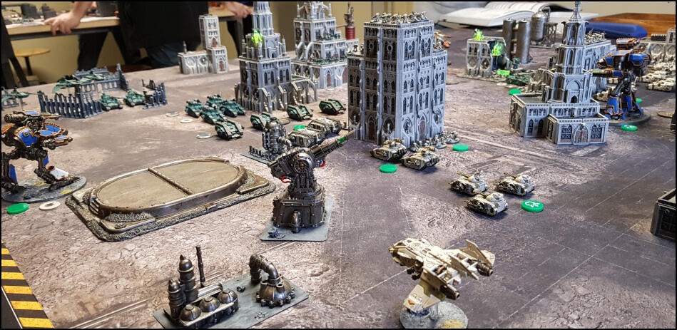 Le Mecanicum devait récupérer le Fabricator General de la planète qui était dans le seul bâtiment encore intact d’un côté de la table pour l’emmener dans la barge d’évacuation au centre de la table tout en contrôlant le gros bâtiment côté gauche pour pouvoir désactiver le champ de protection de la zone astroportuaire pour laisser partir la navette.