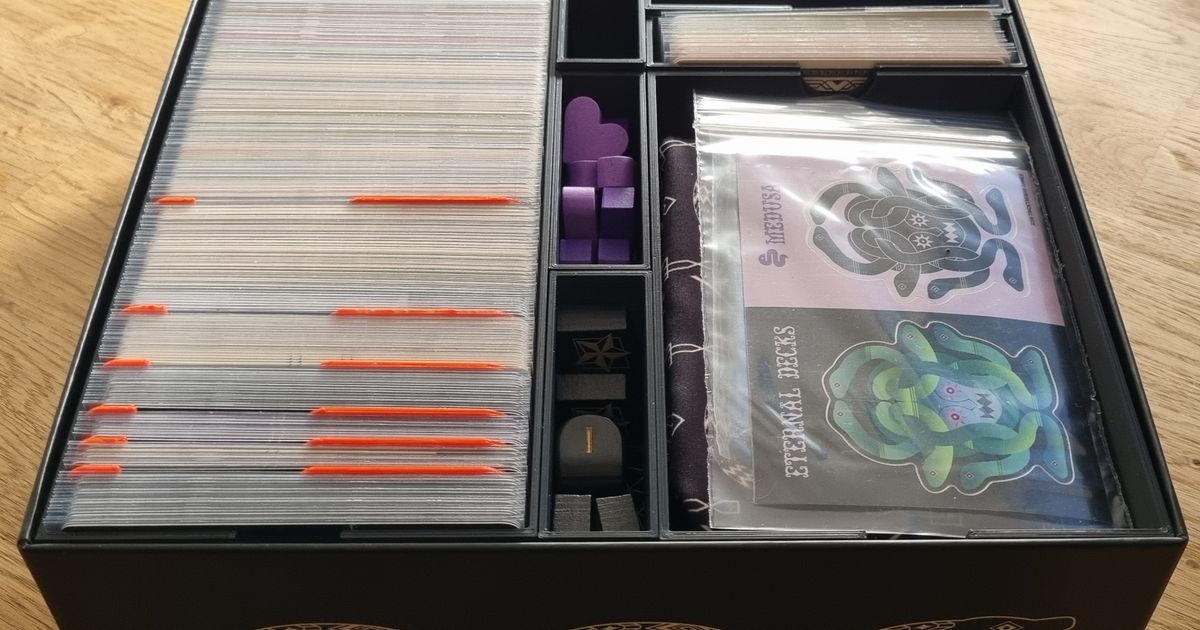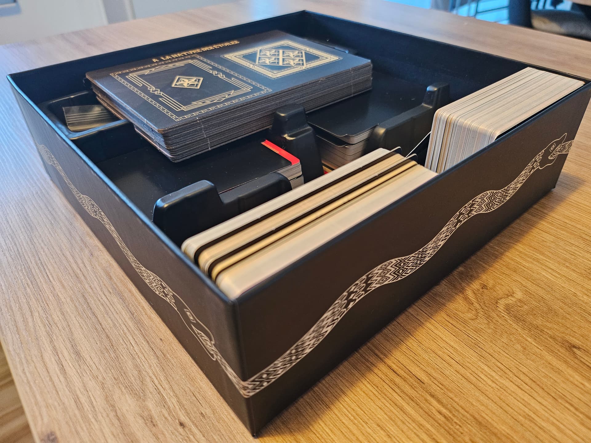 Bon, je comprends bien le fait de mettre les cartes sur la tranche dans 2 compartiments, mais quand on voit qu’elles arrivent en haut de la boîte et qu’elles ne sont pas sleevées, ça va poser problème avec les manuels et le tapis. Je n’aime pas avoir des couvercles surélevés dans mes jeux.