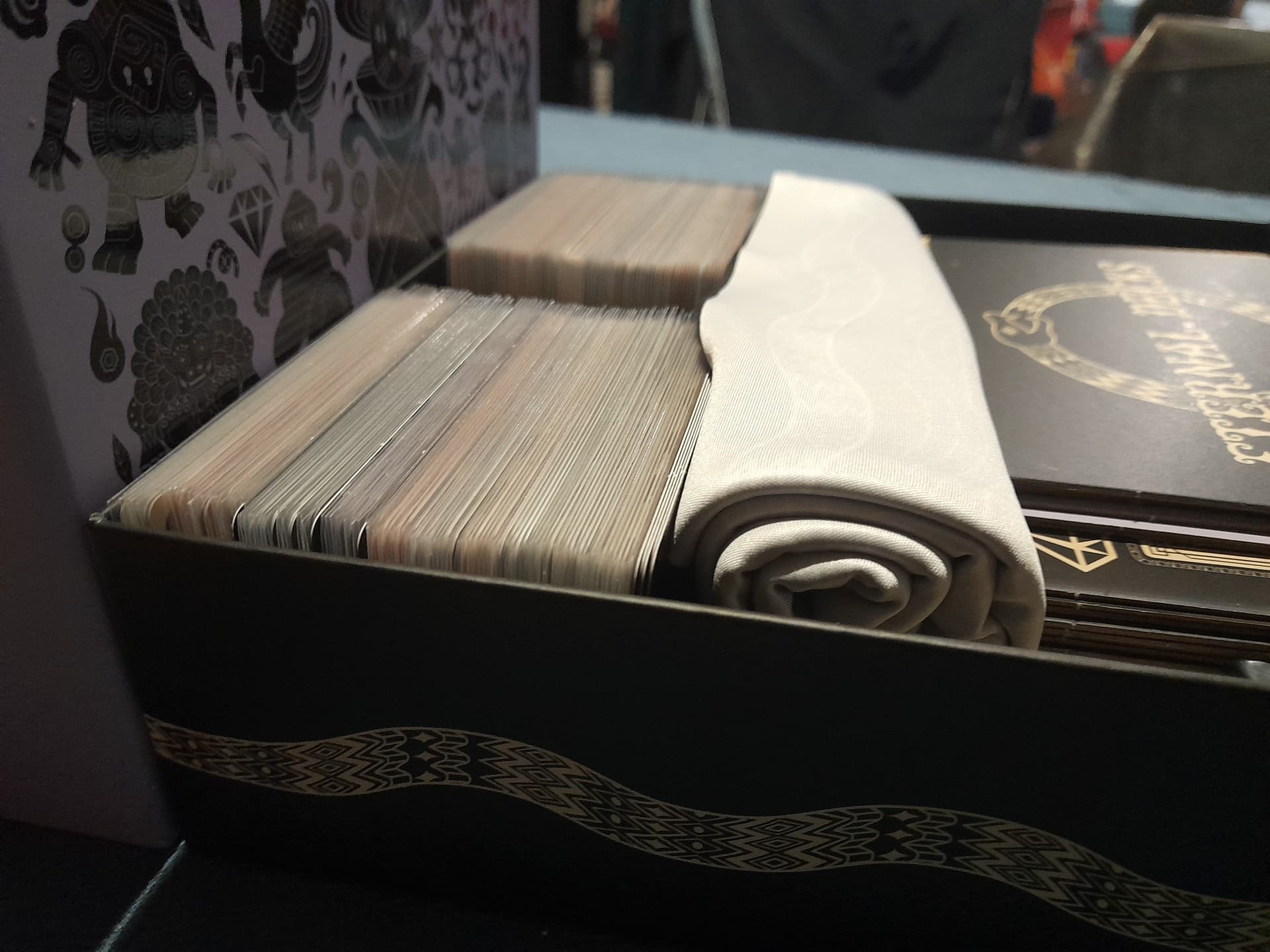 Je n’utilise pas de nappe sur mes tables. J’ai bien des playmats universels pour mes jeux, mais aucun au format carré ni assez large/haut pour accueillir le tissu du jeu.