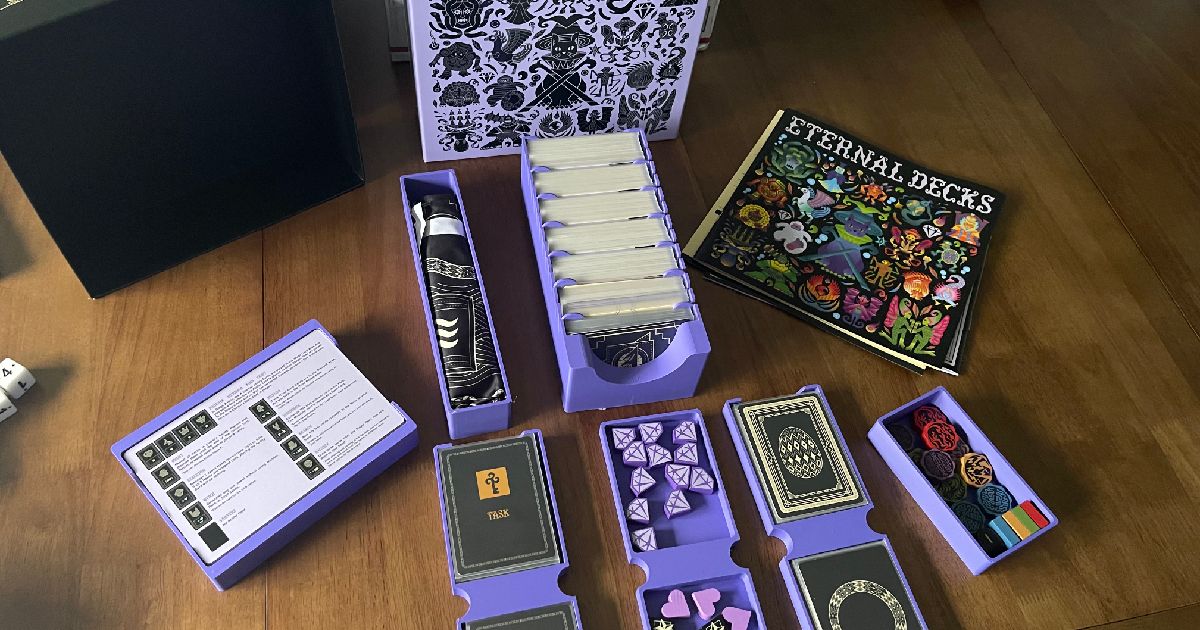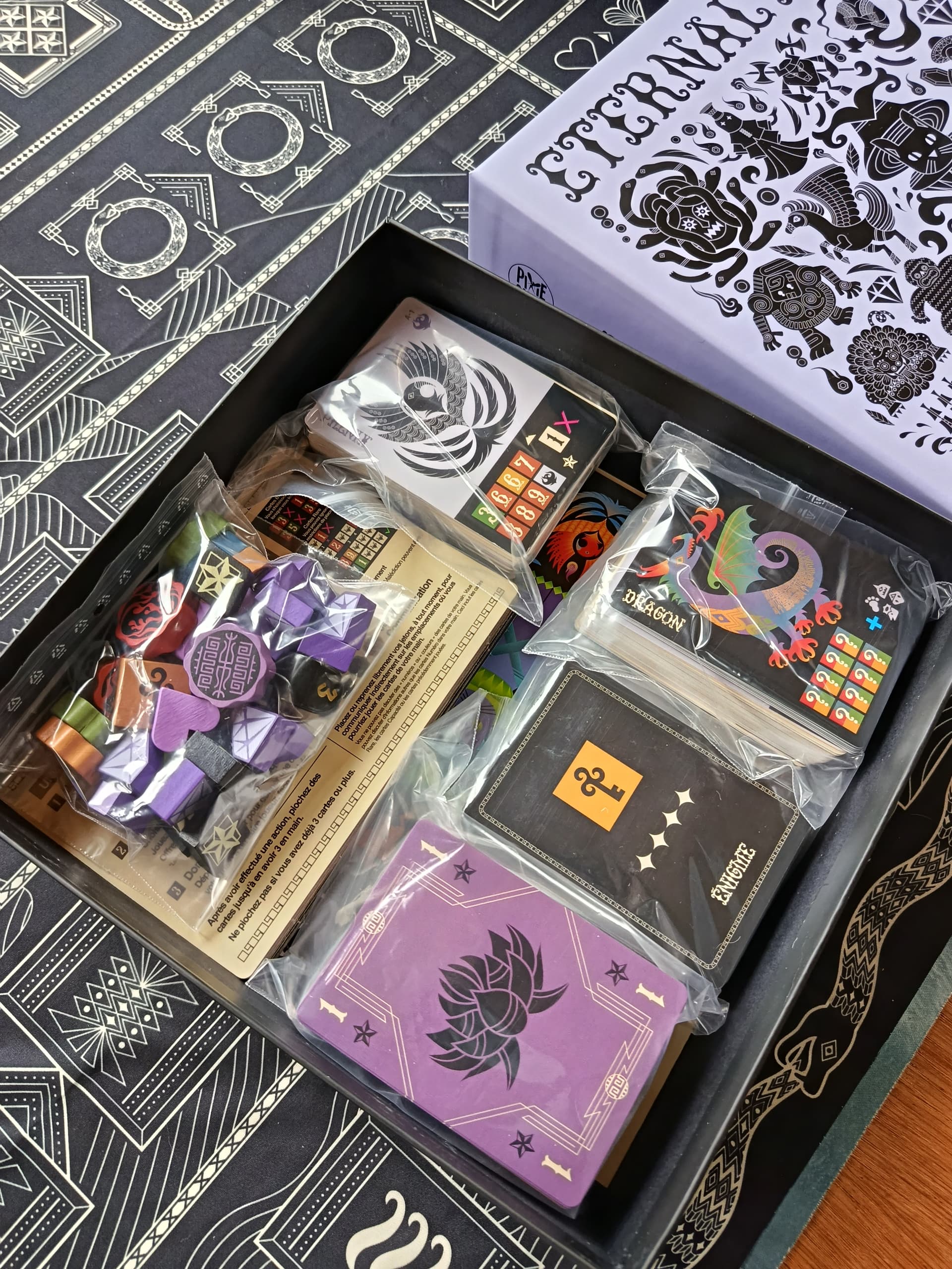 Le matos est qualitatif (je trouve les cartes assez épaisses), mais pas super fan du tapis en tissu très léger qui glisse beaucoup sur une table en bois. A tester avec une nappe ou un playmat en dessous.