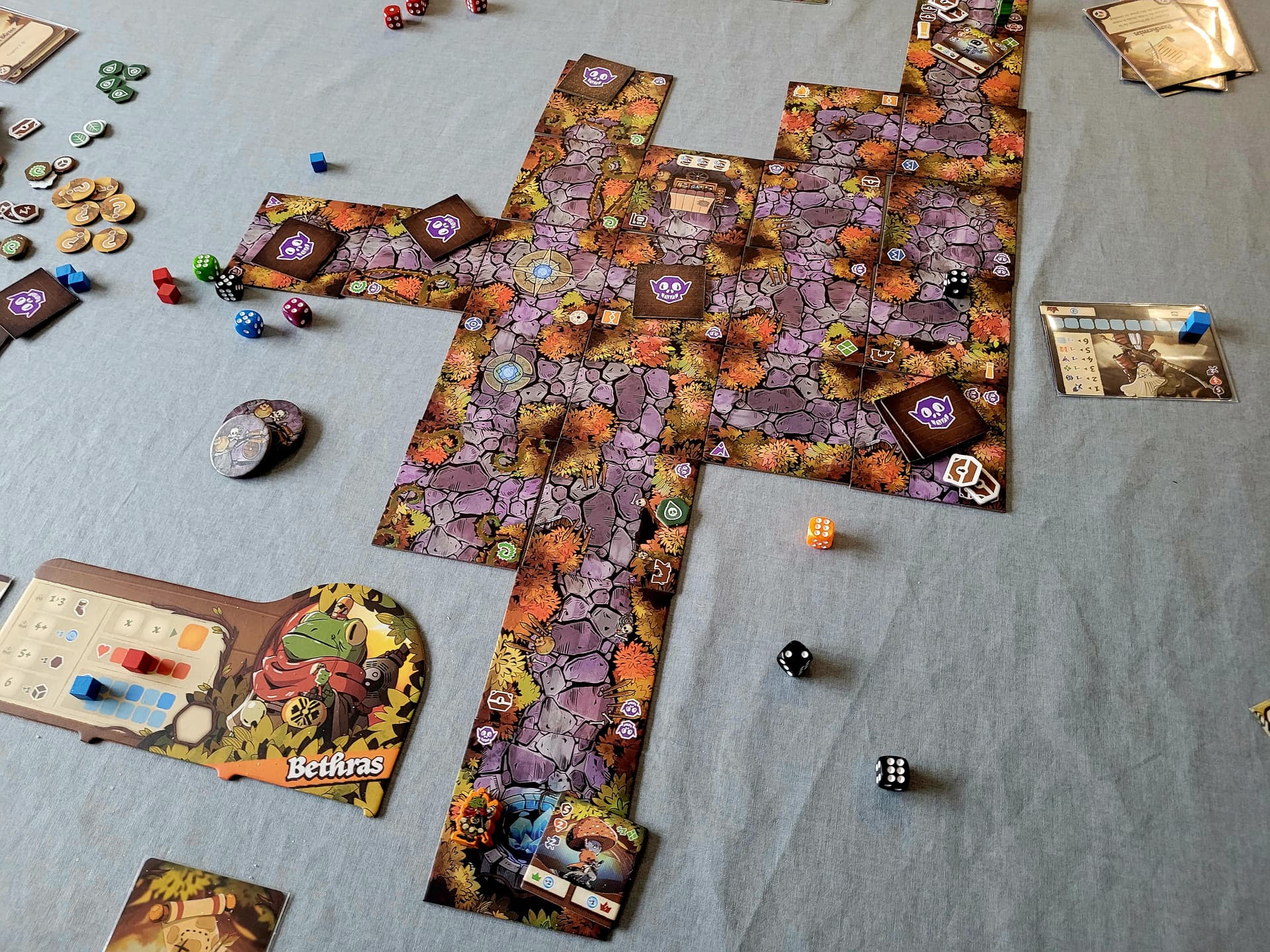Pourtant la mécanique est très simple : on joue d’abord une phase d’exploration toute simple qui ajoute des tuiles sur la carte. Puis s’en suit une phase d’aventure où on bouge notre petit Gus selon des résultats de dés.