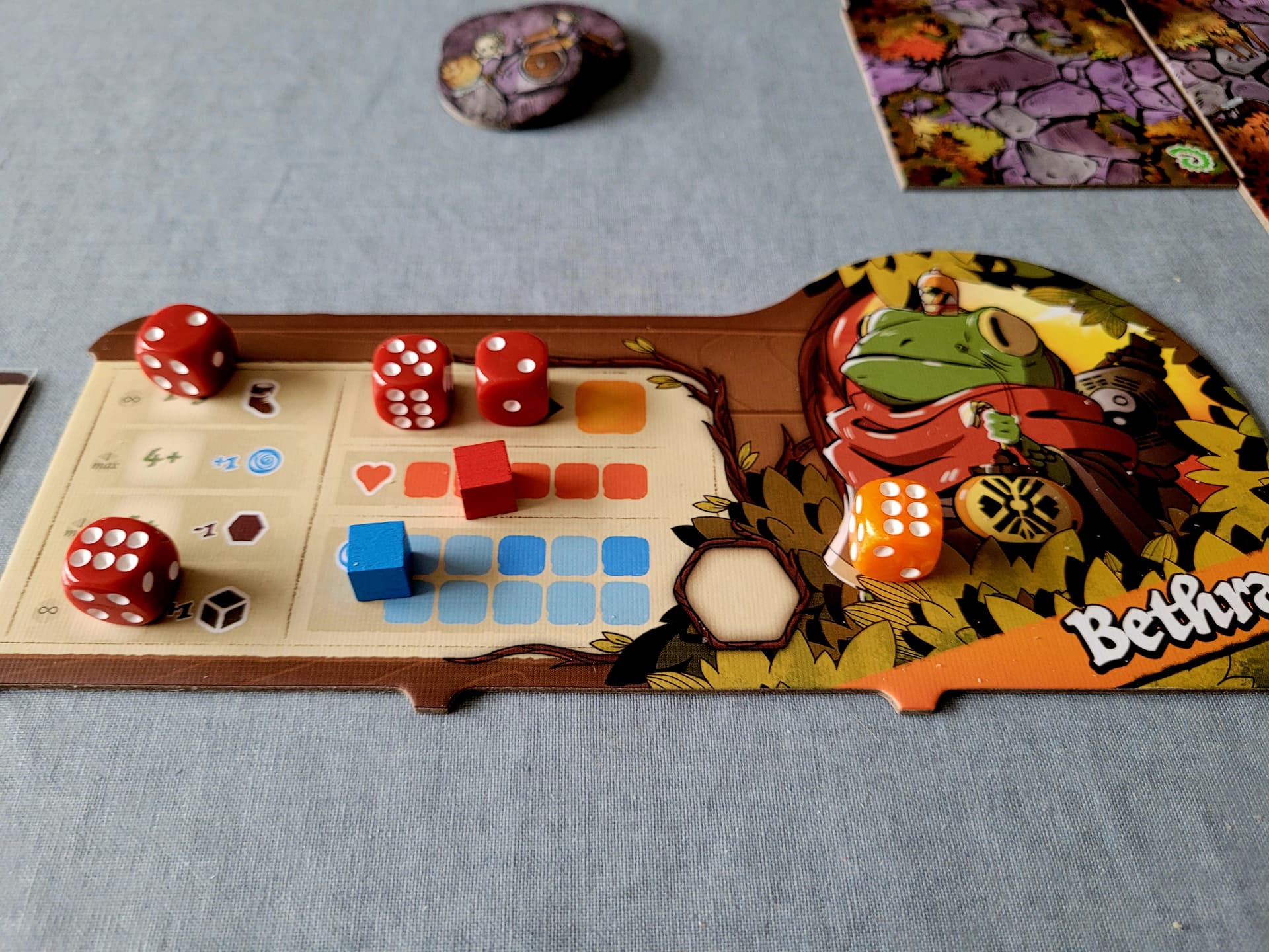 - la seule façon de regagner tout ses PV d’yn coup est de terminer dans la tuile feu de camp. Il y a bien sur la possibilité de chopper les 2 cartes potion de soin (+2 PV) via le deck trésor ( 25 cartes ). Mais vous n’allez pas risquer de perdre des PVs pour en regagner hypothetiquement, non ?