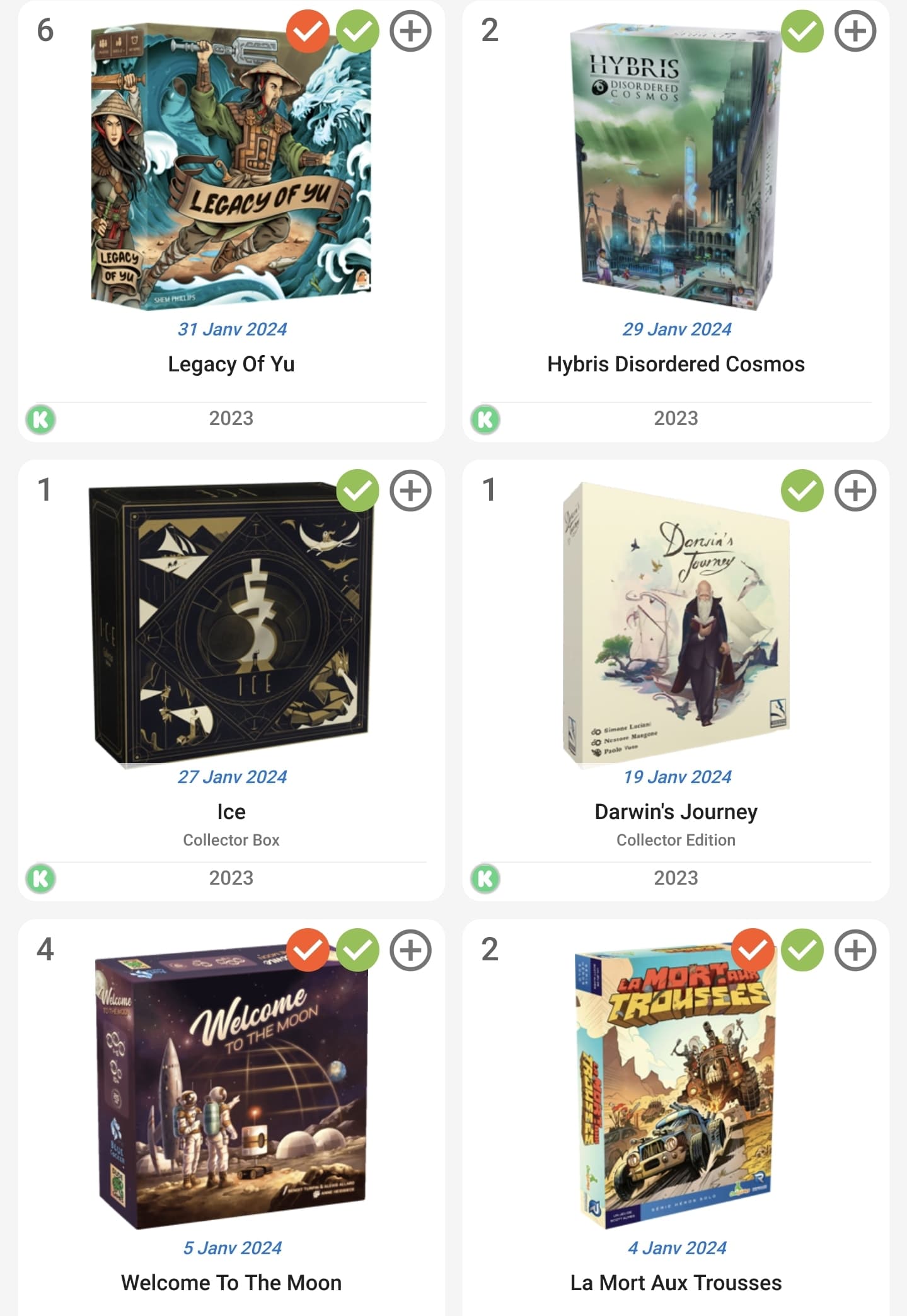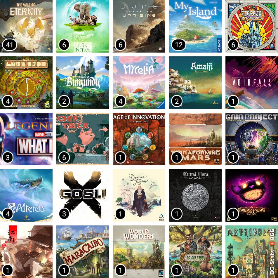 Et aussi 1 great western sur bga, 1 ark nova, qqes castles of burgundy (j’avais envie de connaitre le jeu avant d’envisager l’achat de la deluxe, le jeu est bon mais je n’achèterai pas), plein de challengers (c’est mon jeu de quand j’ai 10 ou 20 minutes) et qqes heat (sans doute une dizaine quand même)