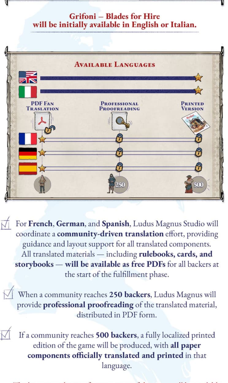 Chaque joueur incarne un commandant de la légendaire compagnie Grifoni et guide sa bande de mercenaires à travers les marchés animés, les accords secrets et les missions périlleuses de la Renaissance italienne. Au fil d’une série d’actes, le jeu alterne entre une phase narrative, utilisant le Livre des aventures pour présenter des choix narratifs qui influencent les événements futurs, et une phase de gestion, où les joueurs recrutent des mercenaires, obtiennent de l’équipement et attribuent des missions.