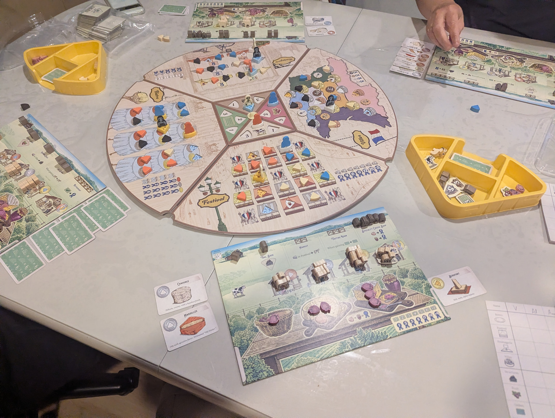 Ben ça ne m’étonne pas le jeu va vraiment vite, c’est une de ses qualités je trouve. Tu vas jouer environ 14 tours et à chaque tour tu décides juste combien de ressources tu récupères et quel fromage tu produis. Bon peut-être un peu ce que tu fais sur ton plateau. Comme tout le monde joue en même temps, 3 min par tour c’est raisonnable.