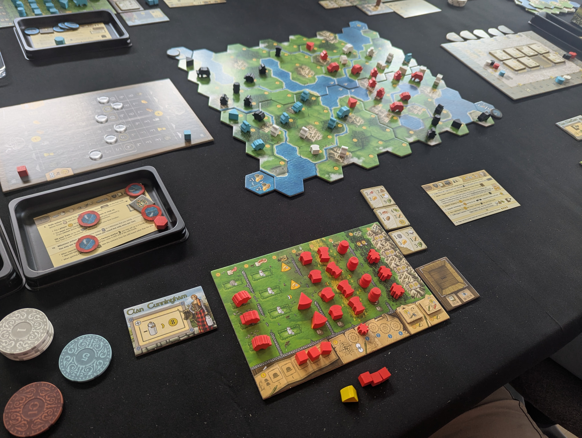 On aura des développements très différents, avec deux joueurs qui se concentrent sur les contrats (dont une qui parvient à remplir trois contrats dès le premier tour et se gave), et deux autres qui sont plus sur l’expansion. Chacun a son propre rythme, ses propres moments où c’est la galère de thune ultime et ils ne font rien à leurs rounds et d’autres rounds où c’est la folie.