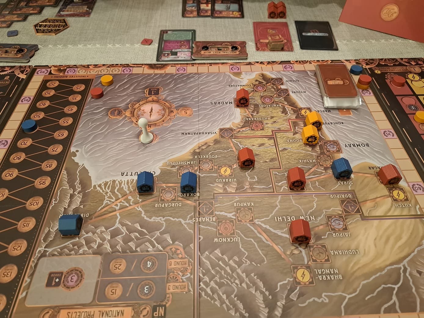 Mais on jouait à 3 joueurs. Tycoon : India 1981 est fait, pensé, pour être joué à 4. Tenez-vous le pour dit. Il y a bien une variante pour 2 joueurs, voire pour jouer en solo (lol), mais j’ai même pas regardé. Si c’est votre configuration habituelle, ne perdez pas votre temps ici, allez trouver mieux ailleurs dans la vaste production ludique.