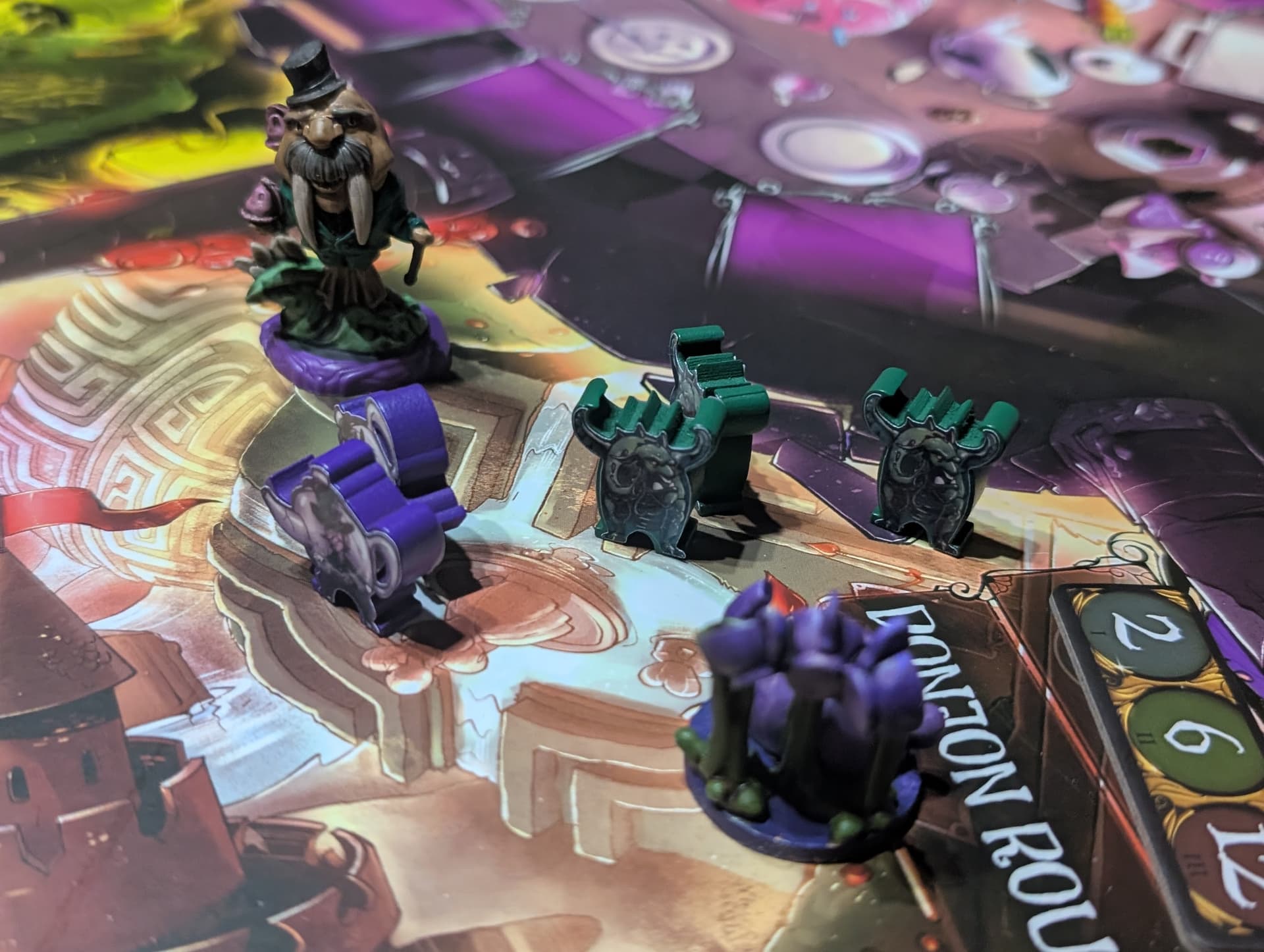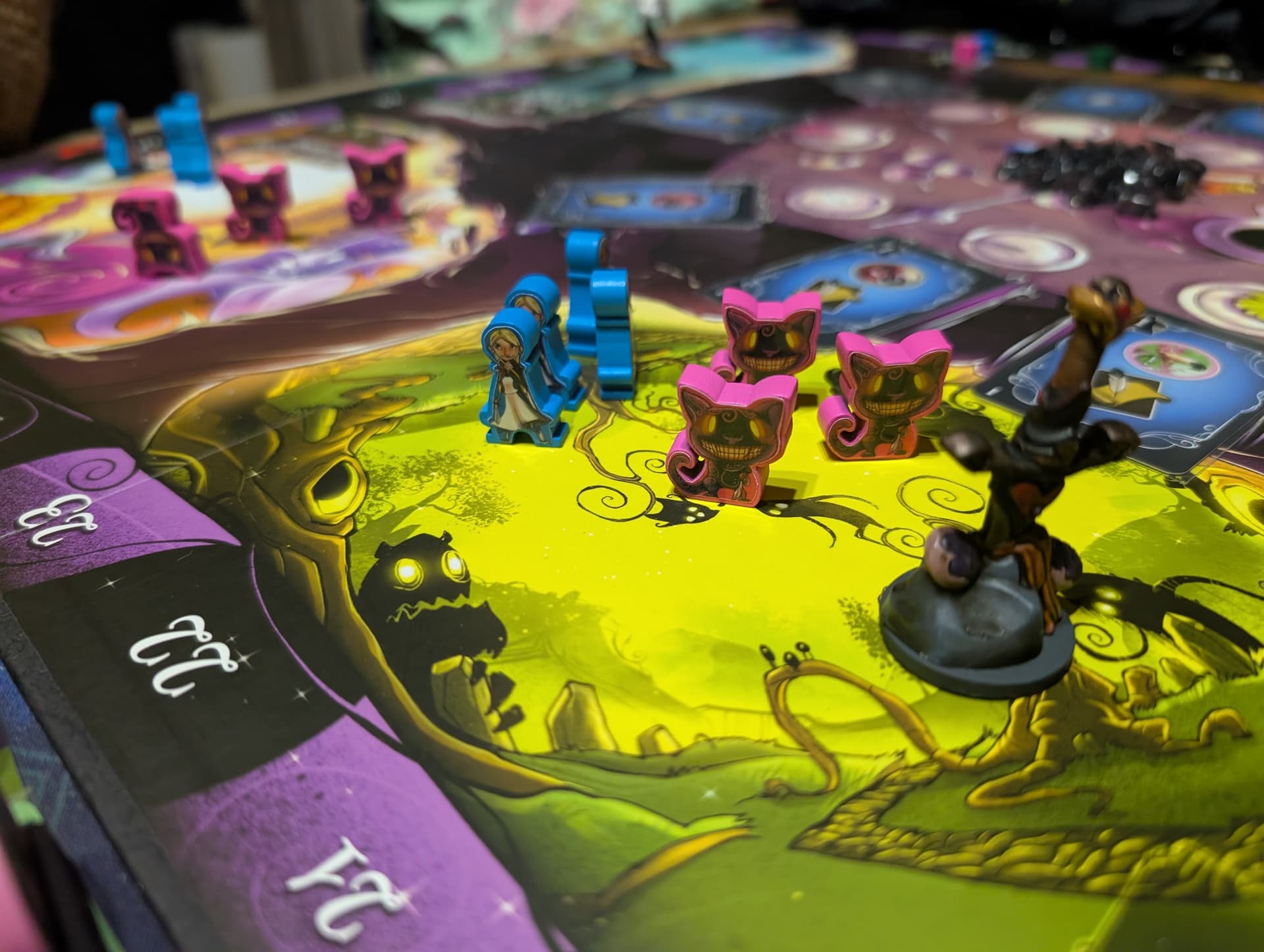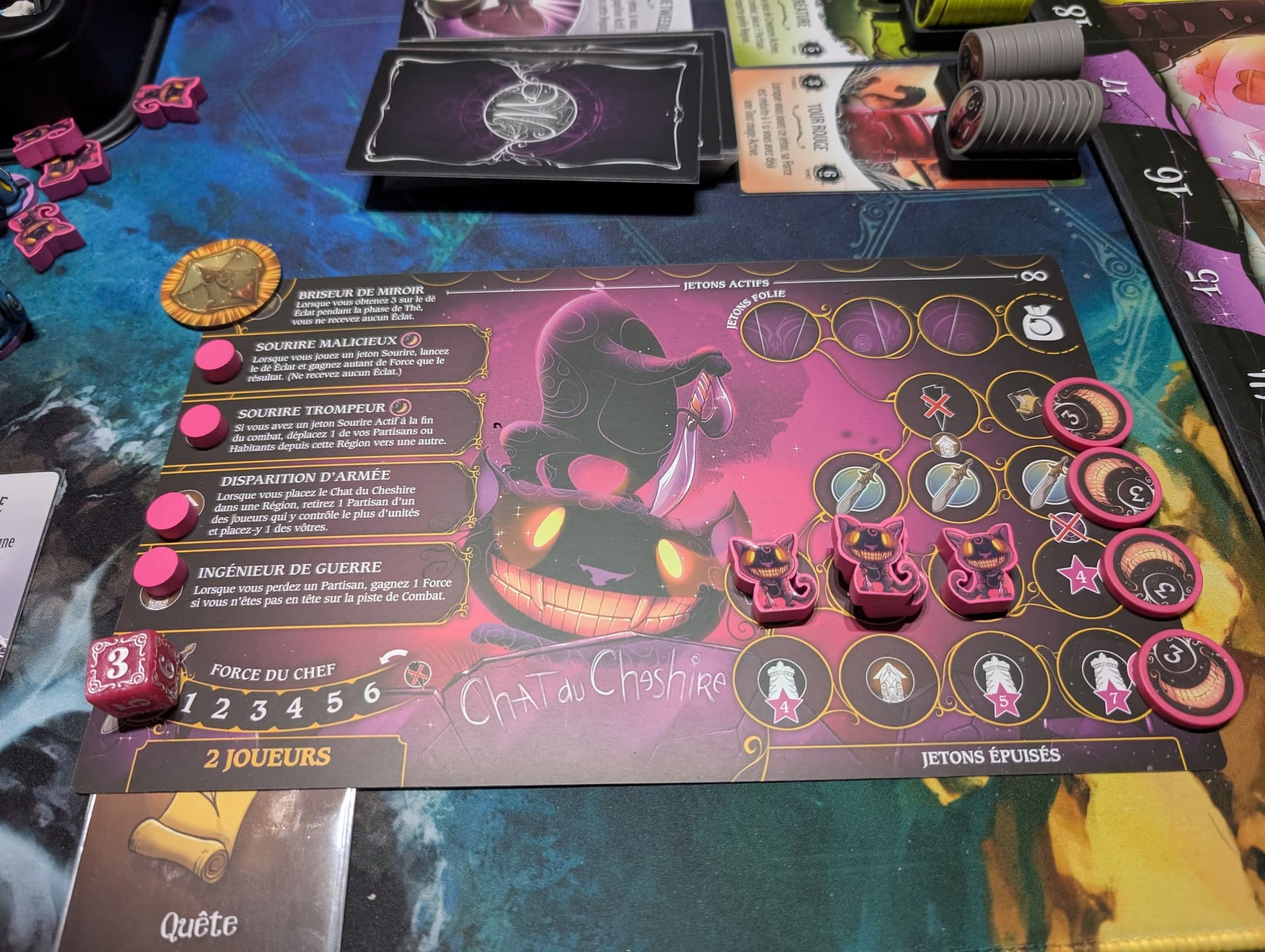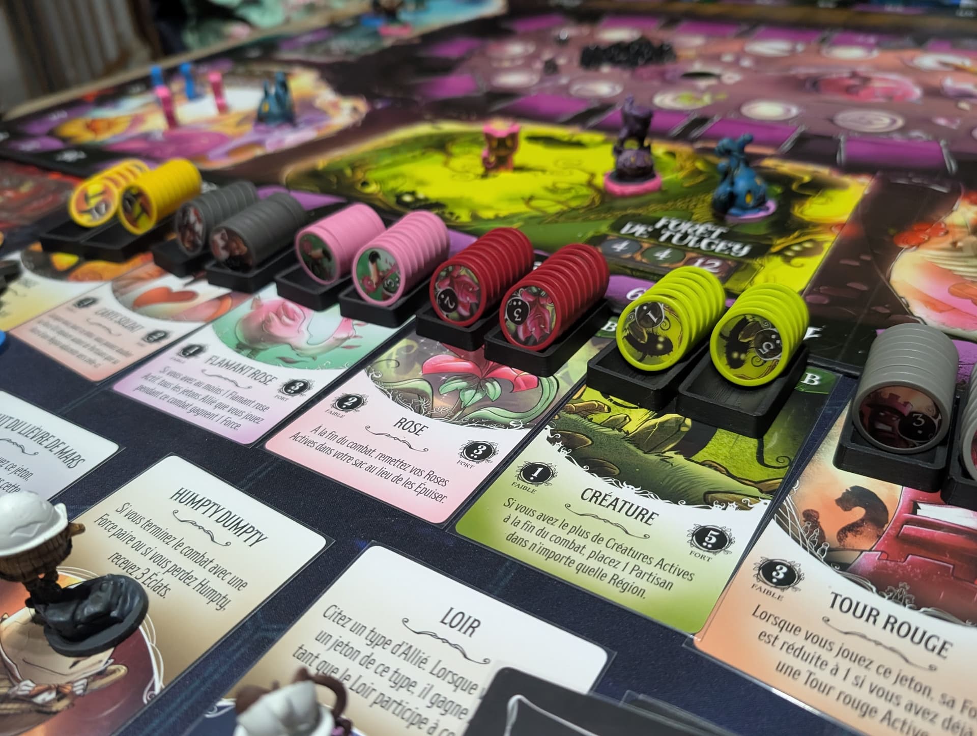 Cependant, Wonderland’s War ne se contente pas d’être une simple combinaison de ces deux jeux. Il ajoute une dynamique de course avec la phase de Thé, où chaque joueur doit jongler entre ses objectifs personnels et les moyens de contrecarrer ses adversaires. Cette interaction constante maintient la tension élevée tout au long de la partie.