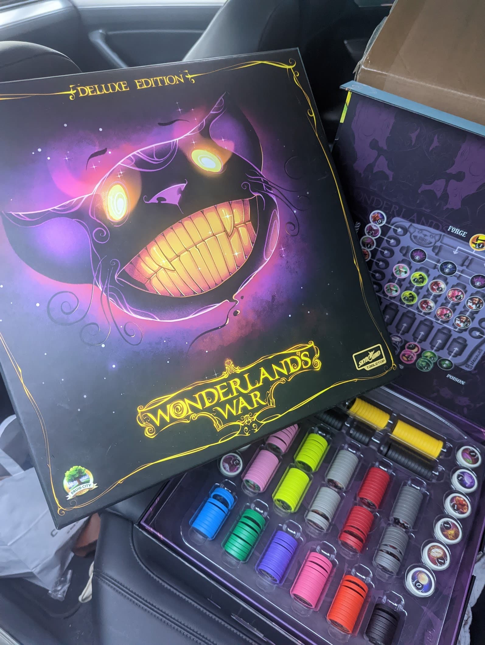 La boîte de Wonderland’s War est énorme, et elle est littéralement remplie à ras bord de matériel. Les figurines des héros sont magnifiques (et pour ma part, je les ai fait peindre, ce qui ajoute une dimension visuelle non négligeable). Les jetons en carton sont épais, les cartes de bonne qualité, et l’insert est plutôt bien conçu… à un détail près : si vous sleevez en premium, surtout avec l’extension Folie Écarlate, préparez-vous à des compromis.