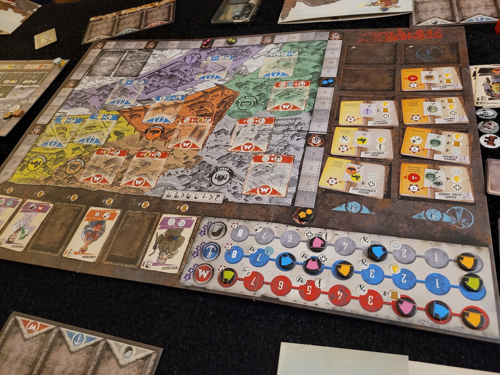 Pendant cette phase, les joueurs se déplacent autour de la table pour sélectionner des cartes qui permettent :