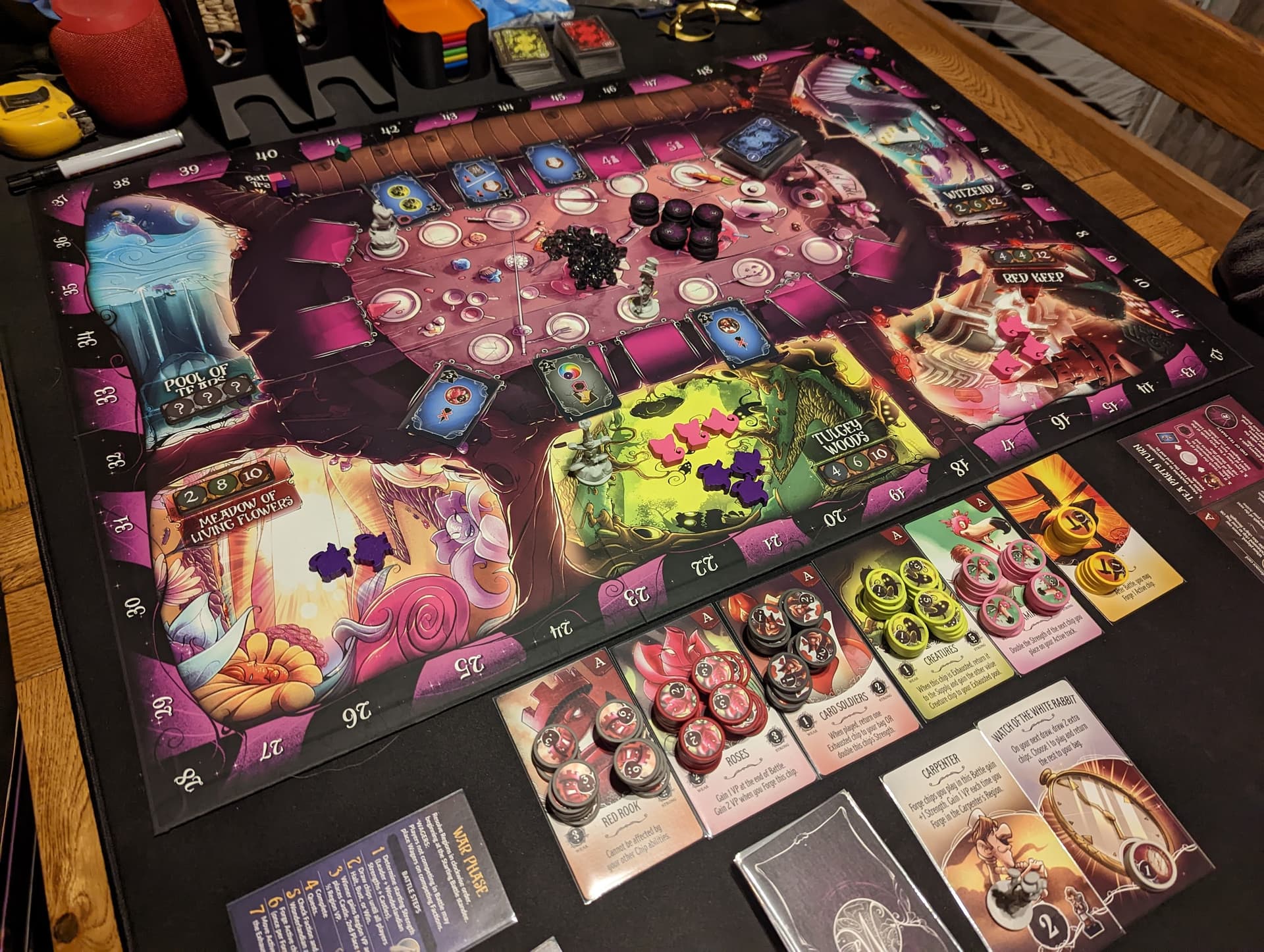 Pour résumer le fonctionnement de Wonderland’s War, on pourrait presque l’appeler « Blood Quacks of Ragelinburg ». Le jeu emprunte les meilleurs éléments de deux grands classiques : Blood Rage, avec son draft et son contrôle de territoire, et Quacks of Quedlinburg, avec son bag-building et son stop ou encore.