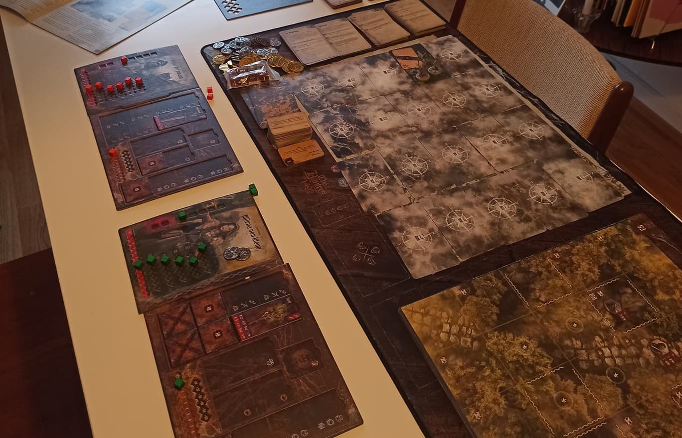 Le jeu est un jeu solo/coop en campagne qui se déroule dans un univers médiéval-fantastique assez sombre (pensez The Witcher par exemple). Il y a évidemment du narratif, des choix à faire, des déplacements sur une carte de la région, de l’évolution de perso. J’ai joué en solo avec 2 perso, une sorcière et un homme d’armes. J’ai un King pledge (core box, extension Wasserburg dockers , Heroes set et Heroes set 2, Metal coins, Playmat).