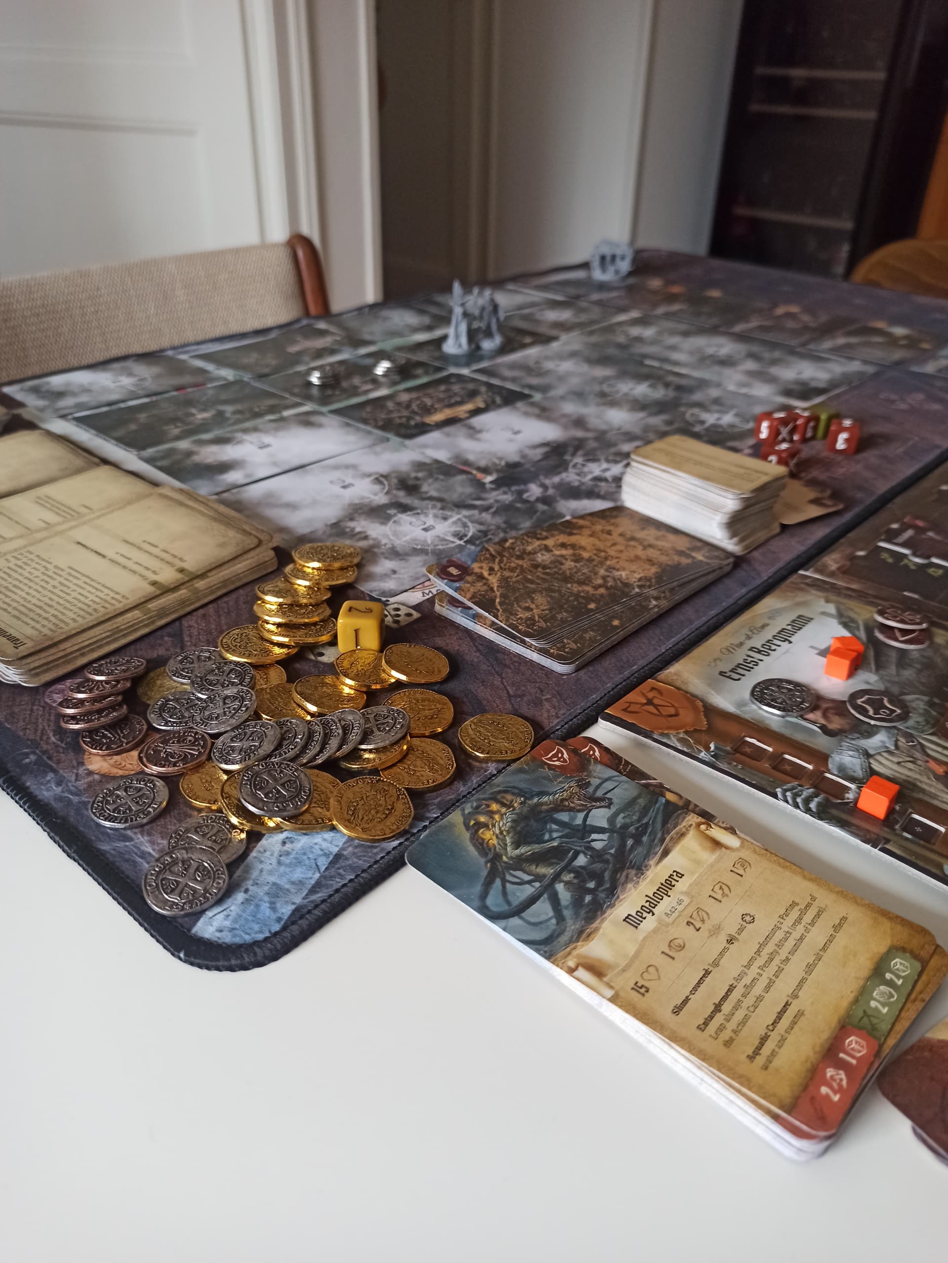 Niveau matos, les tokens sont bien épais, les pièces métal sont vraiment cool, sans être expert le tapis me convient, les cartes ont l’air robuste. Bref côté matos tout roule. La DA est vraiment top, c’est ce qui m’avait fait craquer et je ne regrette pas sur ce point.