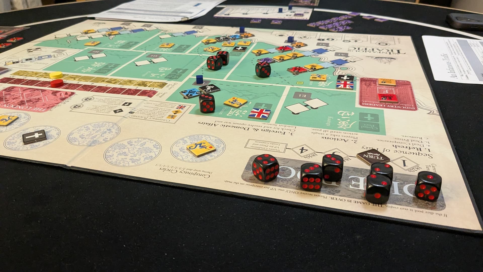 En terme de complexité on est un cran en dessous de Pax Pamir, même si les règles d’An Infamous Traffic sont (comme celles de son grand frère) assez opaques tant qu’on n’a pas commencé à jouer. Une fois la partie lancée en revanche, chaque règle prend sa place au service de la recréation d’une situation historique sans pitié, et tout s’emboîte parfaitement.