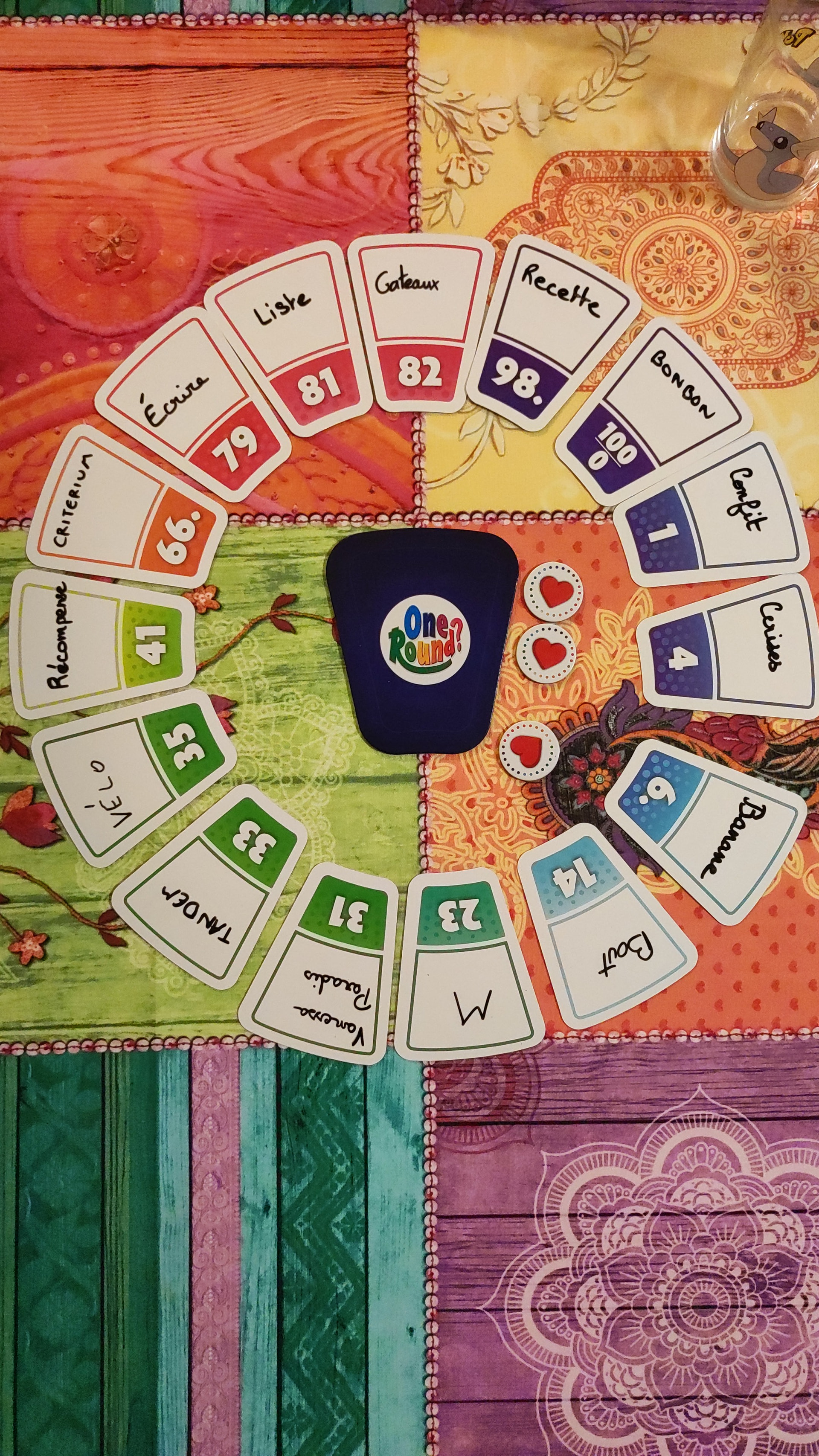 des cartes numérotées de 1 a 100 sur lesquelles les joueurs écrivent des mots qu’il va falloir placer correctement pour que les nombres se suivent en cercle (0=100) - 12 mots a trouver pour gagner