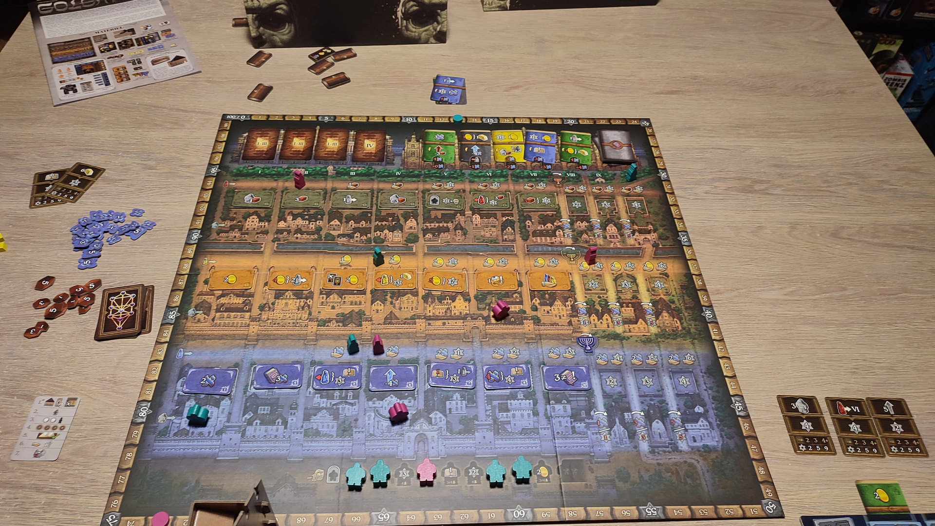 Le matériel et la DA ne font pas rêver, ça fait très jeux à l’allemande, c’est pas très beau et le thème est vraiment pas dingo. On joue des juifs à Prague au 16eme siècle qui cherchent à créer des golems et à les utiliser. On a déjà vu mieux.