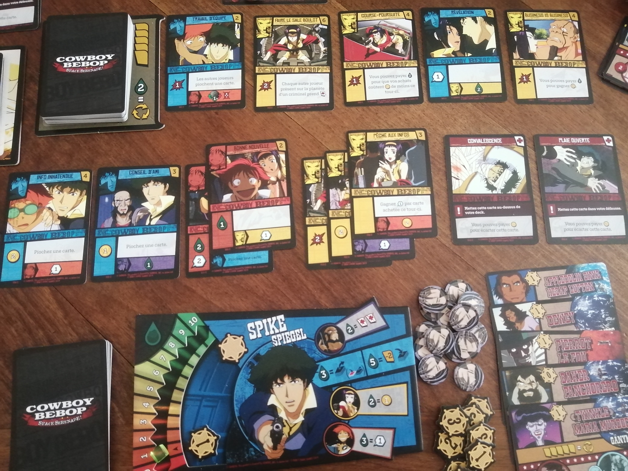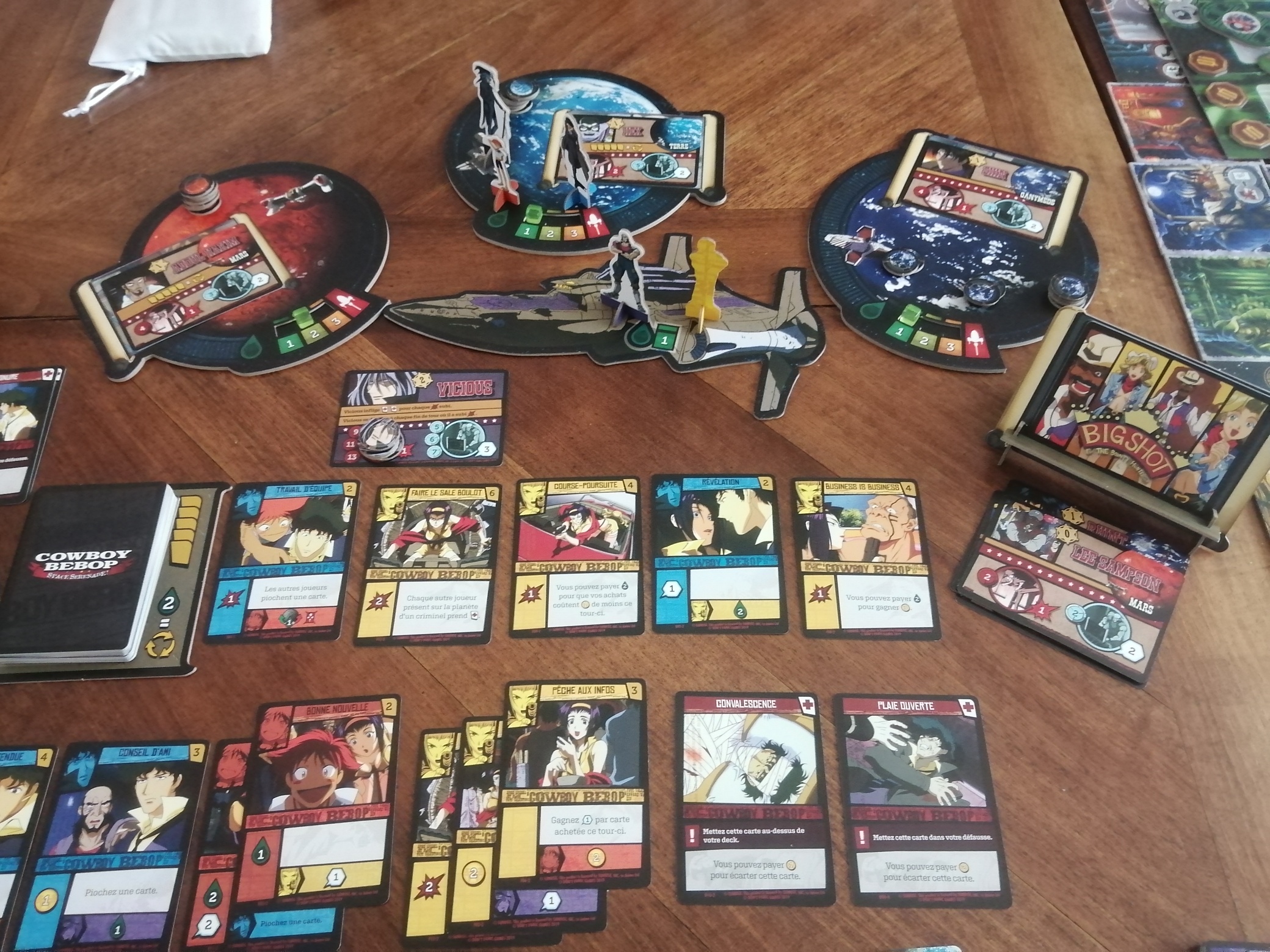 Si tu as l’occasion, n’hésites pas : c’est d’apparence très classique mais il y a plein de petites originalités qui le font se démarquer : les deux façons de faire des prisonniers : soit par des blessures qui les affaiblissent mais on choppe alors des cartes blessures plus ou moins violentes qui viennent polluer ton deck et il faudra payer soit en or soit en carburant pour s’en défaire : l’avantage, c’est efficace : en général, 1 touche = 1 jeton; soit en enquêtant : ça évite les blessures mais c’est plus long (2 pour 1). On le voit bien sur Twinkle Maria Murdock. Il y a aussi le côté déplacement d’une planète à l’autre : il faut du carburant et selon l’évolution de la partie, y accéder peut coûter jusqu’à 3 carburants. Au delà de cette jauge, le hors la lo s’évade et vient renforcer le deck de Vicious pour la confrontation finale. Le bigshot (l’écran qui diffuse les avis de recherches) est également à surveiller et on peut s’amuser à estimer où va apparaitre le nouveau hors-la-loi et s’y déplacer avant, y placer des PNJ ; bref plein de petites astuces et une belle courbe d’apprentissage. En plus, chaque chasseurs de prime a sa façon de jouer.