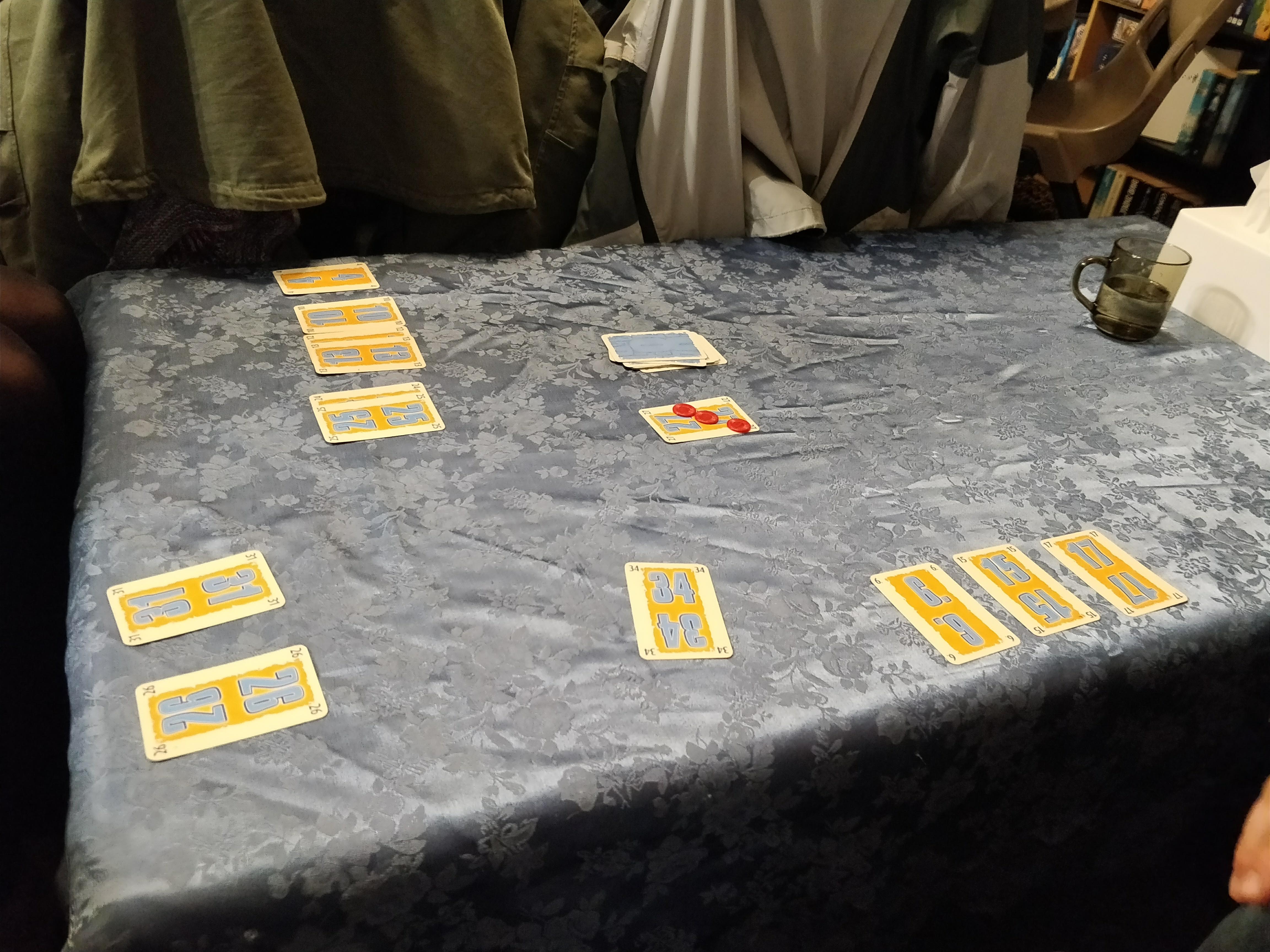 Un vieux jeu (2004, pensez donc) tout simple, mais terriblement malin : un paquet de carte (numérotées de 4 à 45 mais on en enlève 9 faces cachés au début de la partie), 11 jetons par joueur, on dévoile une carte, à votre tour vous pouvez soit la laisser et il faut déposer un jeton dessus, soit la prendre (avec les jetons qu’elle contient). À la fin du jeu vous additionnez les chiffres de vos cartes et déduisez le nombre de jetons qu’il vous reste, le plus petit score l’emporte. Le twist étant que si vous arrivez à faire une suite (32, 33, 34, 35 par exemple) vous ne scorez que la plus petite carte (32 ici, et pas 134).