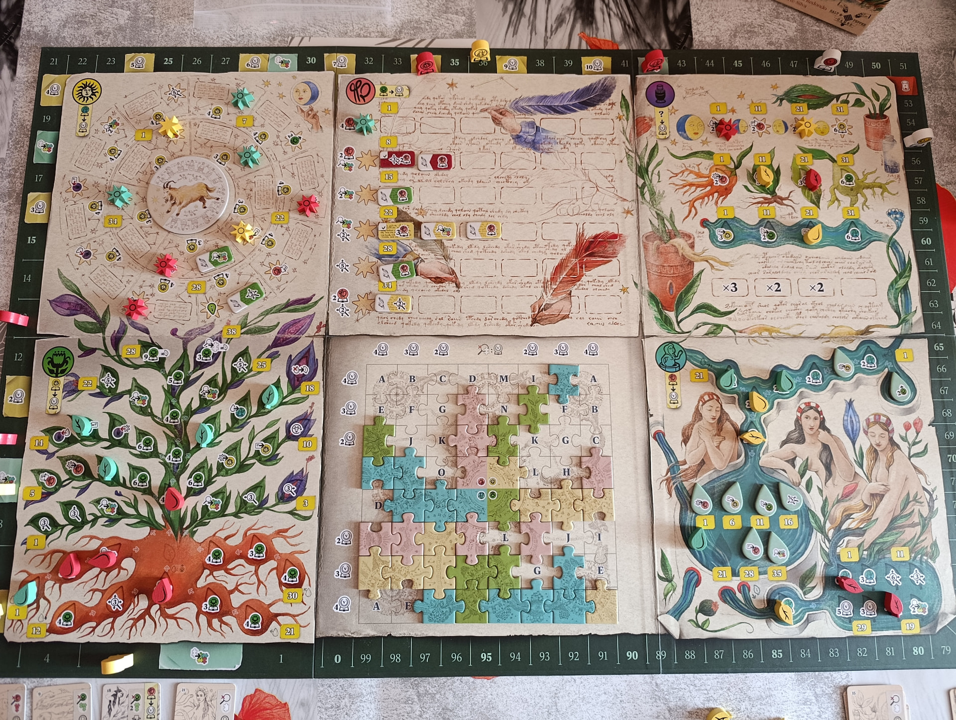 Lors de la mise en place, on est dans la situation du début des années 50 : le système solaire n’a pas encore été découvert en détail : peut-être y-a-t-il de la vie sur Venus ? Peut-être qu’il est impossible d’atterrir sur Mars ? Peut-être y-a-t-il des ressources rares sur la Lune ? Pour simuler cela, on tire pour chaque astre une carte face cachée : dès que l’astre sera exploré on retourne la carte et on sait ce qui s’y cache… De plus, on tire une carte aussi pour le niveau de radiations solaires et pour le vol suborbital (peut-être que le vol suborbital est sans danger pour le corps humain, peut-être que c’est très dangereux, suspense !)