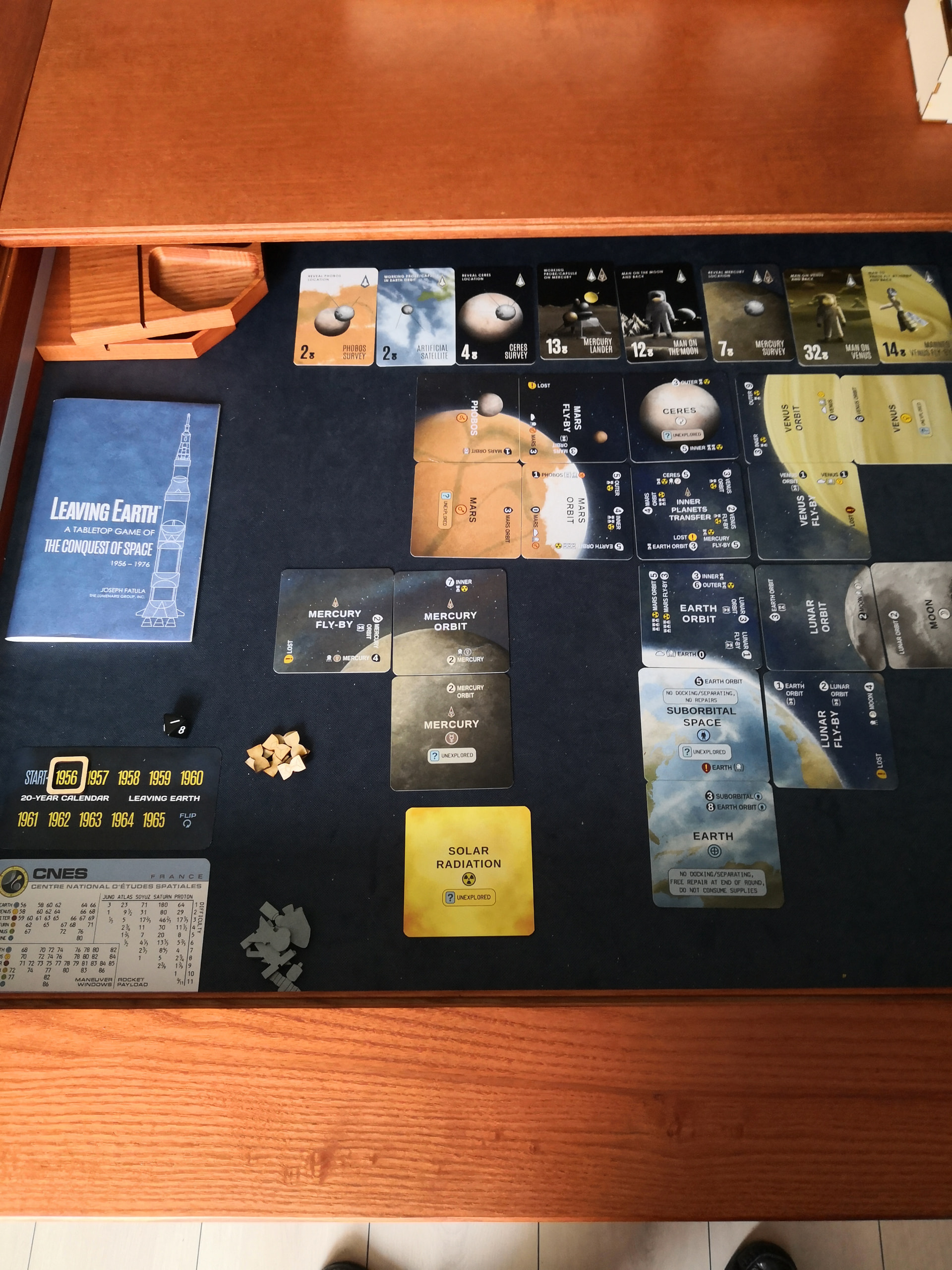 Cette semaine, j’ai décidé de ressortir Leaving Earth, ça faisait 4 ans que le jeu n’était pas sorti (ma femme n’arrive pas à jouer…)