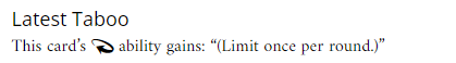 la liste des taboos / tabous : ce sont des modifications pour des cartes existantes, mais ce ne sont pas des erratas, jouer ou non avec les taboos est parfaitement optionnel. En général c’est pour revoir à la baisse la puissance d’une carte (en augmentant son coût, en limitant une capa, en augmentant le nb d’xp nécessaires,…) , on appelle ça un « nerf » ; plus rarement pour en augmenter la puissance (mais ça peut arriver en général en abaissant le coût en ressource de la carte). Dans le cas de Rex, sa capacité était jugée bien trop forte.