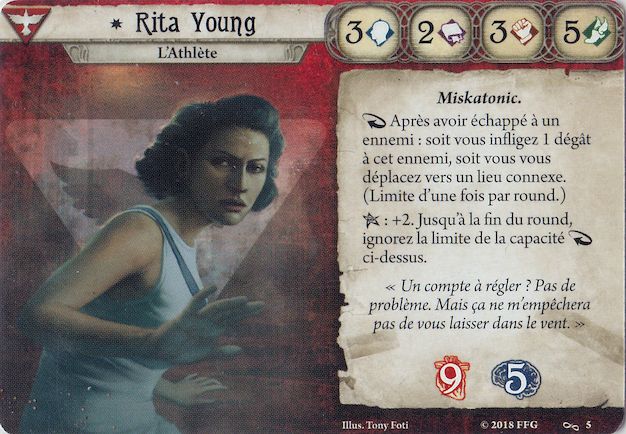 Sa capacité se déclenche après avoir appliqué le résultat « échappé » (en TC7), pas seulement quand vous avez réussi une action « Échapper à ». Ça combote avec Forcer l’entrée ci-dessus par exemple : si Rita réussit son enquête à +2, elle peut se barrer directos ou coller une petite patate de forain au passage. Si on faisait le parallèle avec le combat on aurait un truc du style « Après avoir infligé un dégât…etc. ».