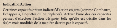 Si sur votre carte l’action apparaît en gras, il s’agit de l’action décrite dans les règles (dont le résultat peut être modifié par la capacité de la carte). Quand on parle de cette action en particulier, vous devez être engagé avec l’ennemi. C’est un peu comme si vous faisiez l’action standard mais avec un effet en plus, du à la carte.