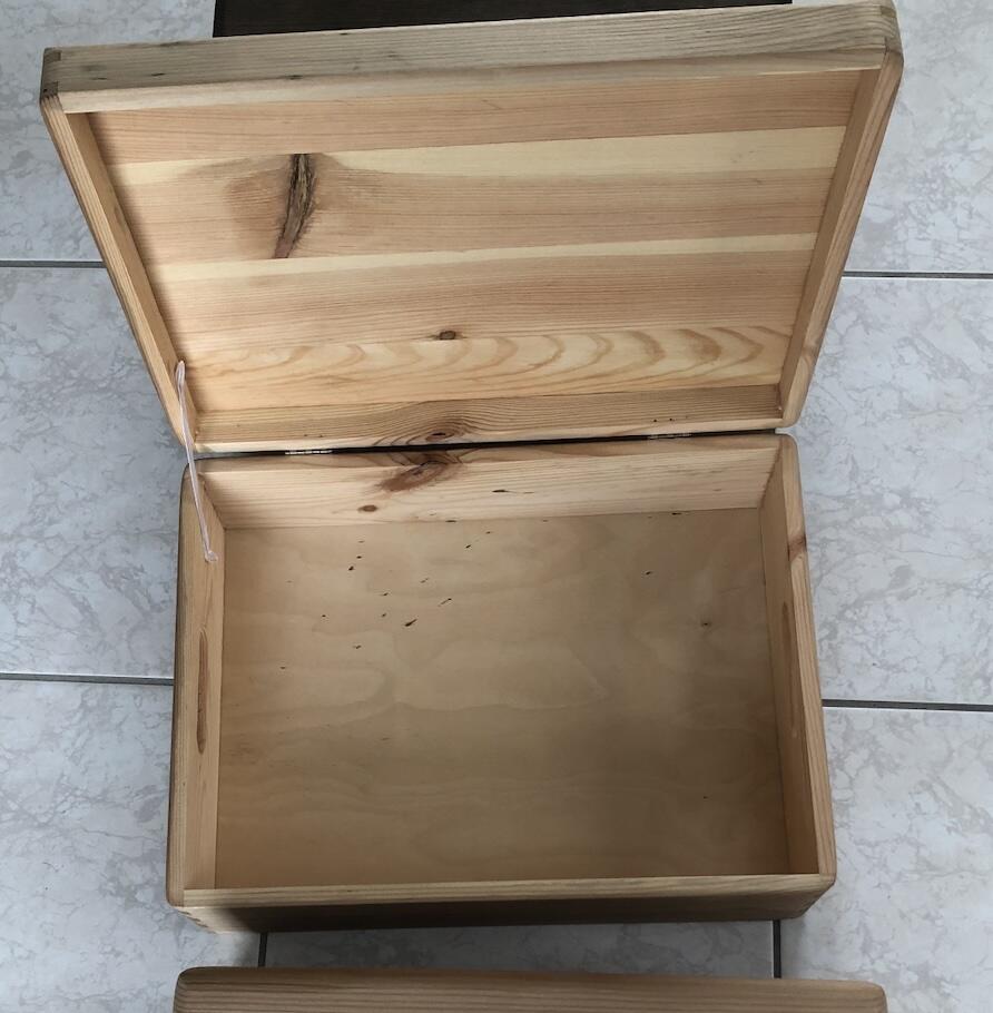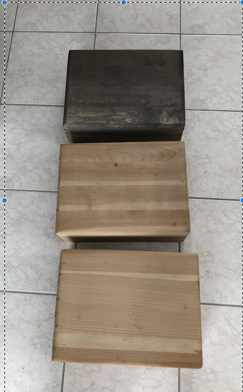 Ponçage et tentatives de vieillissement des boîtes. Méthode de la rouille de laine d’acier au vinaigre en essayant d’obtenir plusieurs teintes pour différencier les 3 boîtes. Ca noircit un peu trop avec la première teinte (les 2 autres boîtes sont justes préparées) :
