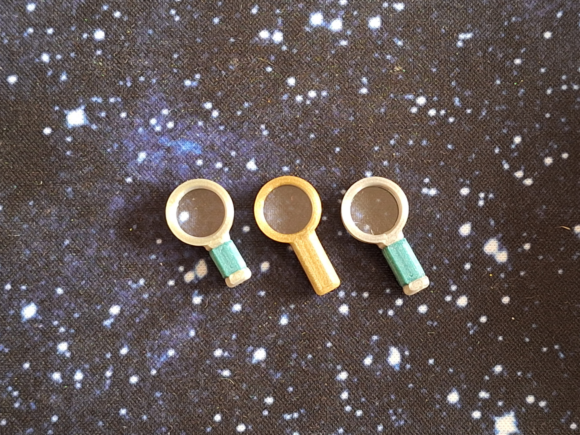 Ca faisait longtemps que je voulais me faire des jetons Indices « Premium ». Je suis parti sur un modèle en deux couleurs (argent et vert nacré), et pour tester j’ai introduit en cours d’impression une rondelle de plexi de 3mm pour simuler le verre de la loupe.