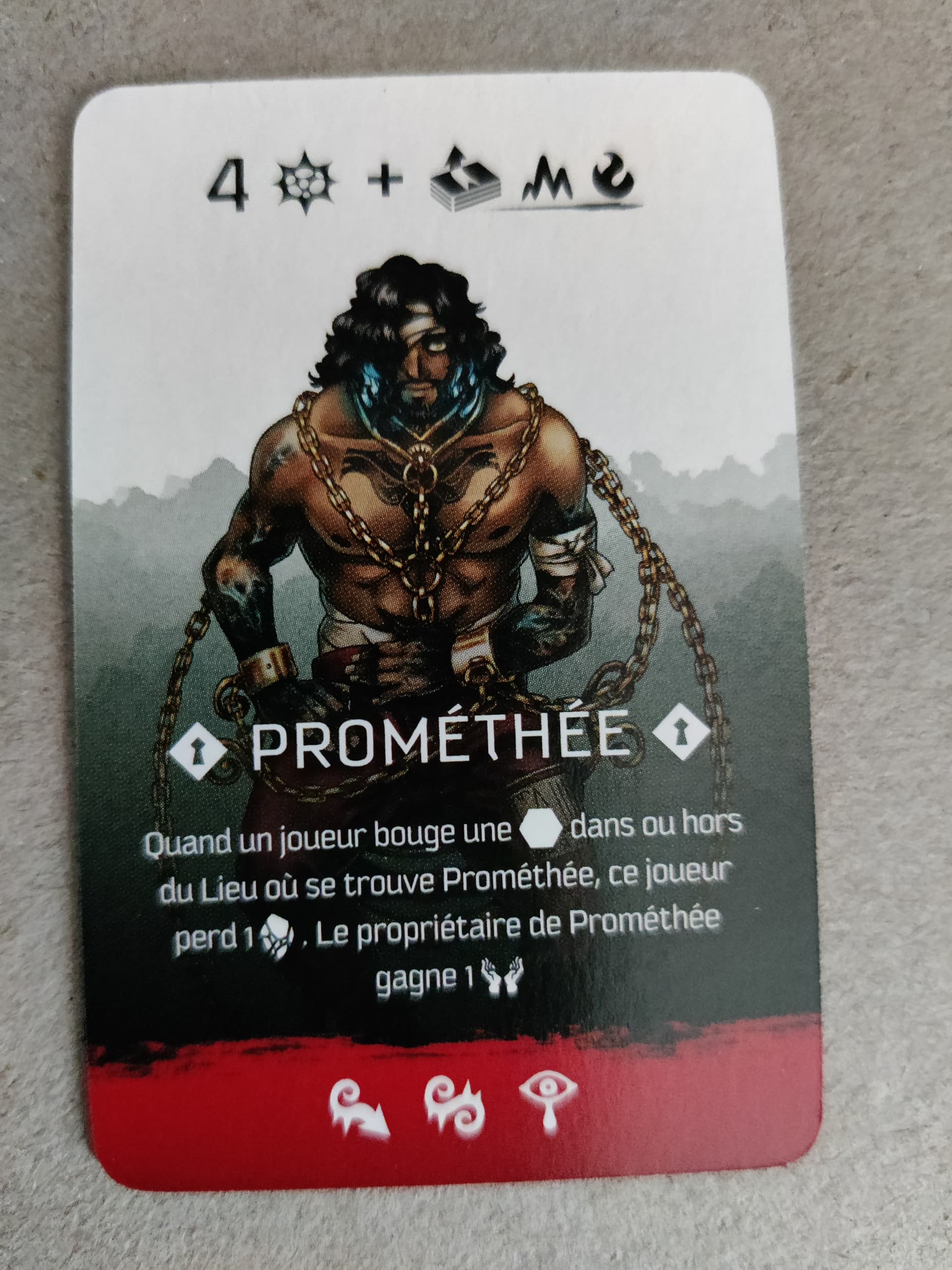 Note de Design : Avoir un effet indépendant de la position de Prométhée est très intéressant, car pour l’annuler, il va falloir aller dans son Lieu pour le battre ! Ce gain de ressource indirect peut ralentir le développement des joueurs de façon assez drastique s’il est employé au bon moment.