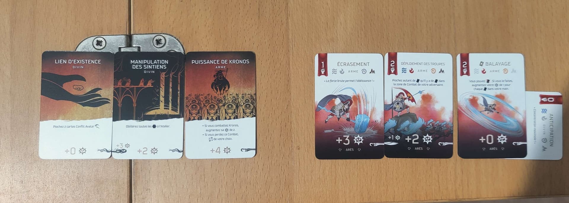 J’avais testé de combattre Kairos car l’entrave qu’il génère a la fin d’une ère est une véritable épine dans le pied. Le combat fut vraiment juste, il m’avait sorti 3 cartes pour un total de 11 de puissance … j’y ai joué mes 4 cartes de combat avec ambition pour obtenir 12. Autant dire qu’espérer se débarrasser des 3 avatars était mission impossible.