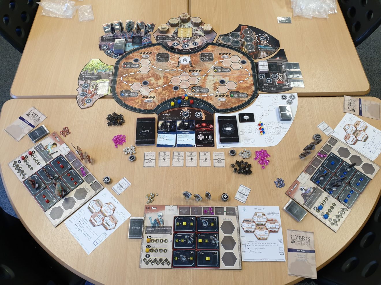 Commençons par le commencement : Hybris est terminé au niveau de ses mécaniques de jeu. Depuis une année maintenant, nous faisons jouer très régulièrement des gens de toute la France soit dans notre studio, soit lors de conventions. Ces playtests sont très importants pour définir l’équilibrage.