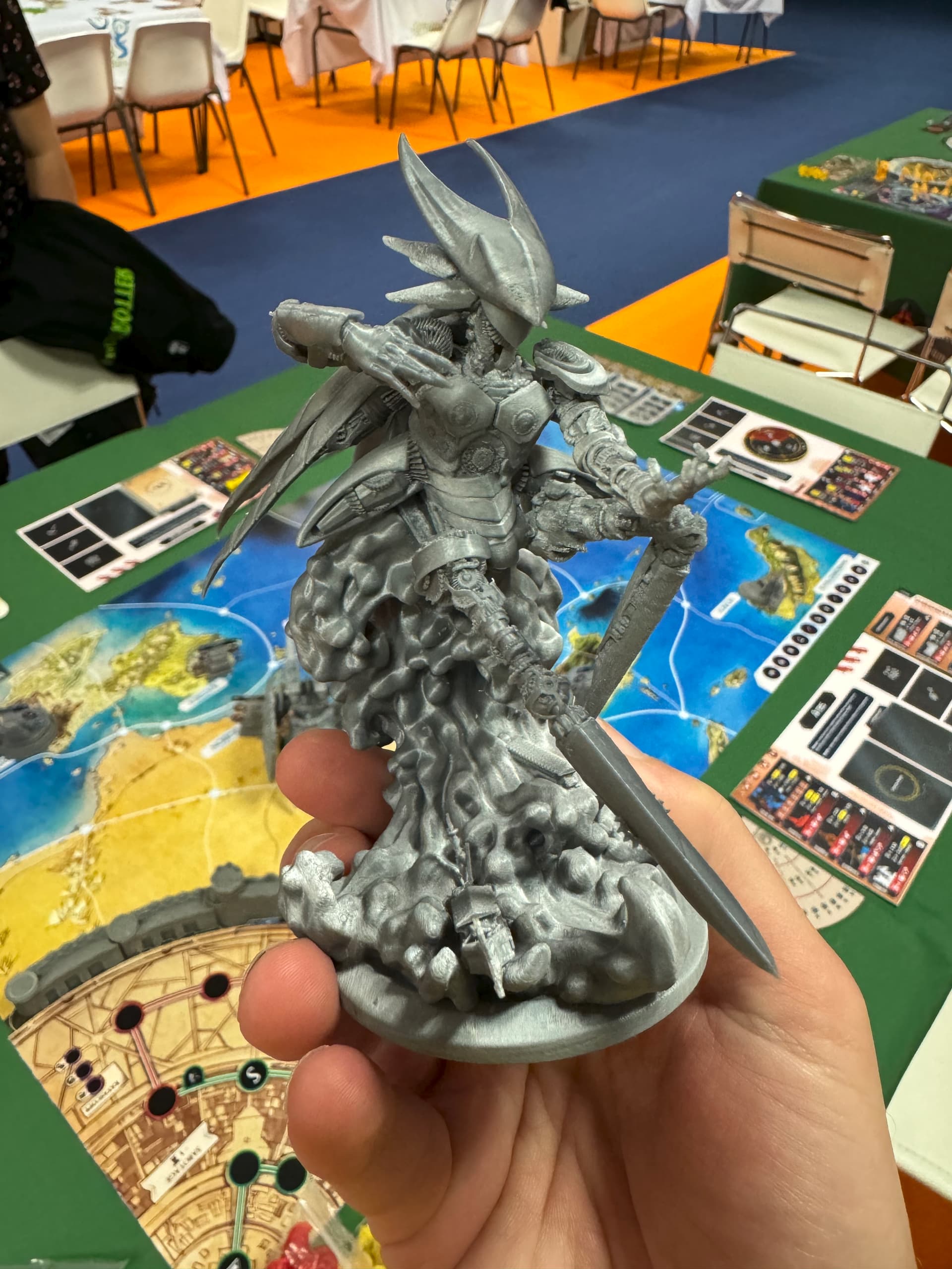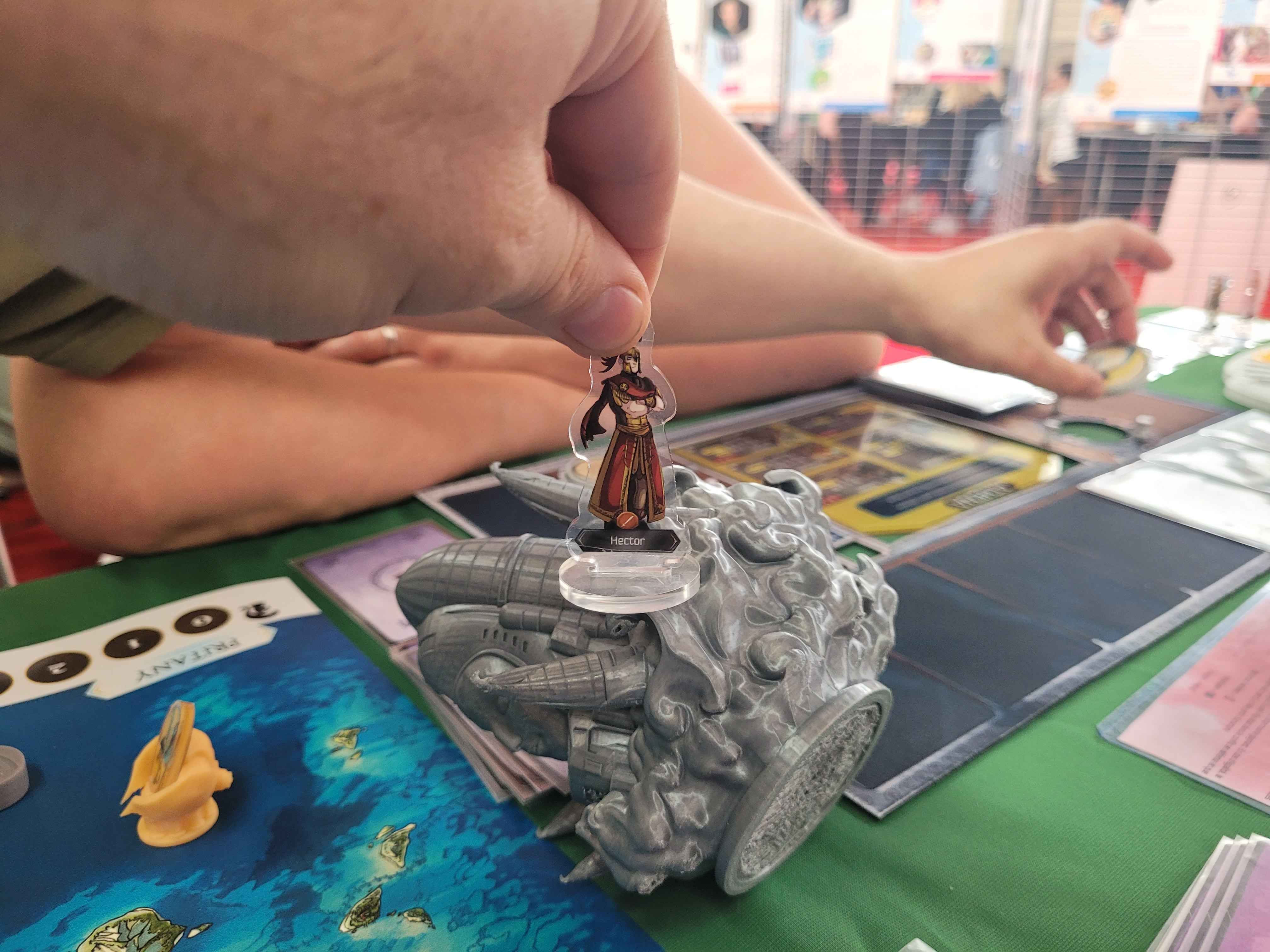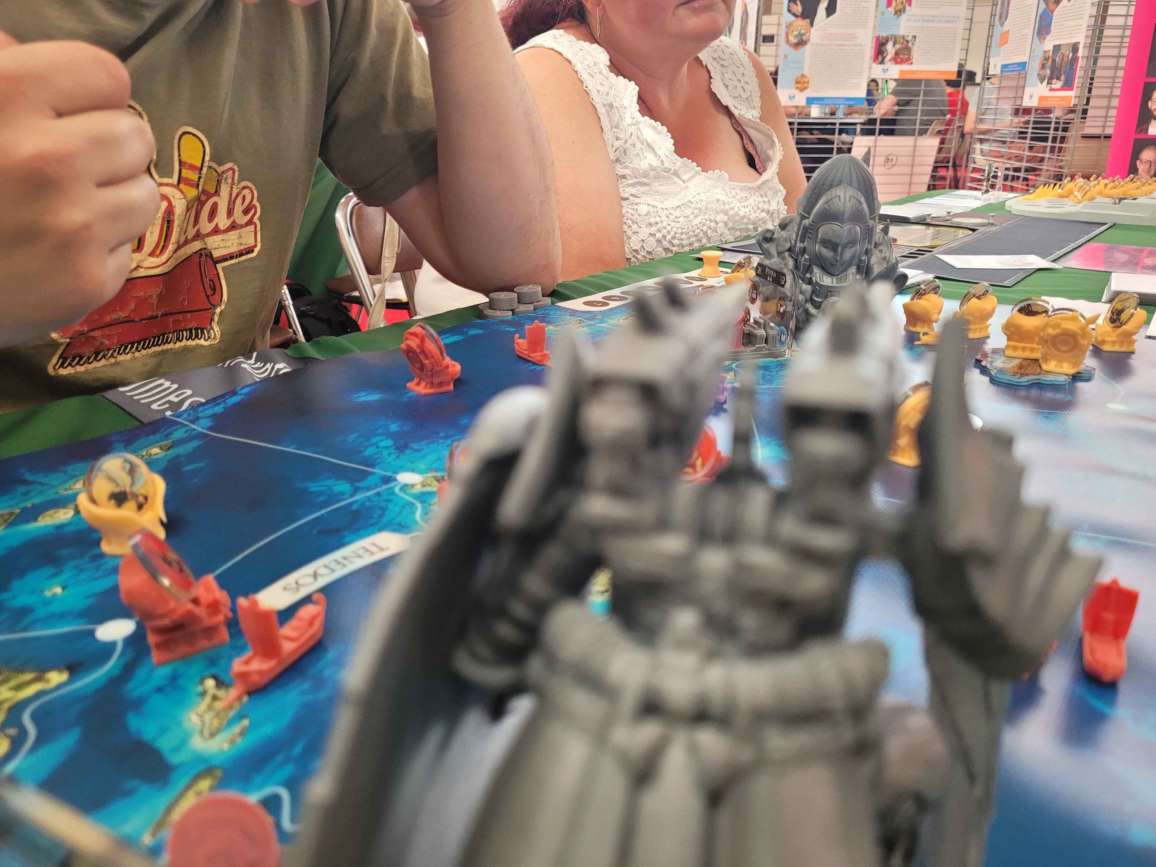 Il s’agissait d’un prototype, ce qui veut dire que ni le matériel ni les règles n’étaient en version finale (Damien a d’ailleurs ajusté en live certaines règles durant les 4 jours du festival). Le combat est maintenant plus simple et plus interactif par exemple. Les figs étaient imprimées sur une « bête » imprimante 3D à fil et pas du tout de la résine. Malgré cela elles étaient sublimes (d’après Damien, leur taille finale devrait être 10-15% plus petites). J’adorerais vous parler des mille idées géniales que Damien a eu pour le matos dans sa forme définitive mais j’ai trop peur de me faire taper (chez vous un indice en bas de votre écran : acrylique et néoprène).