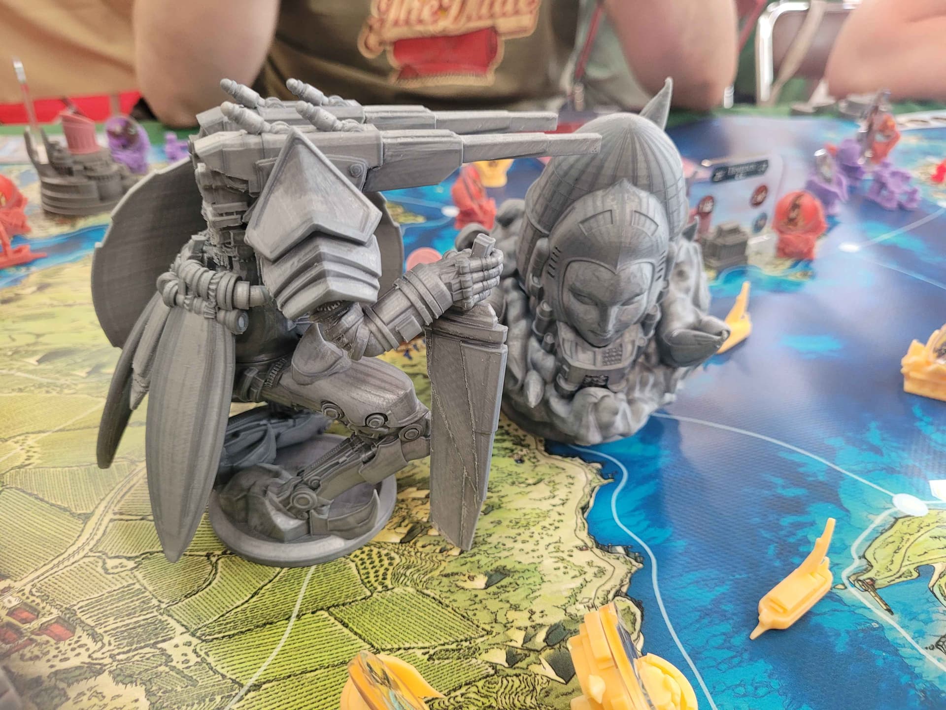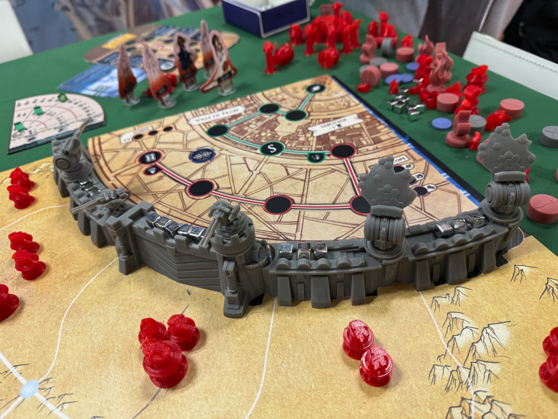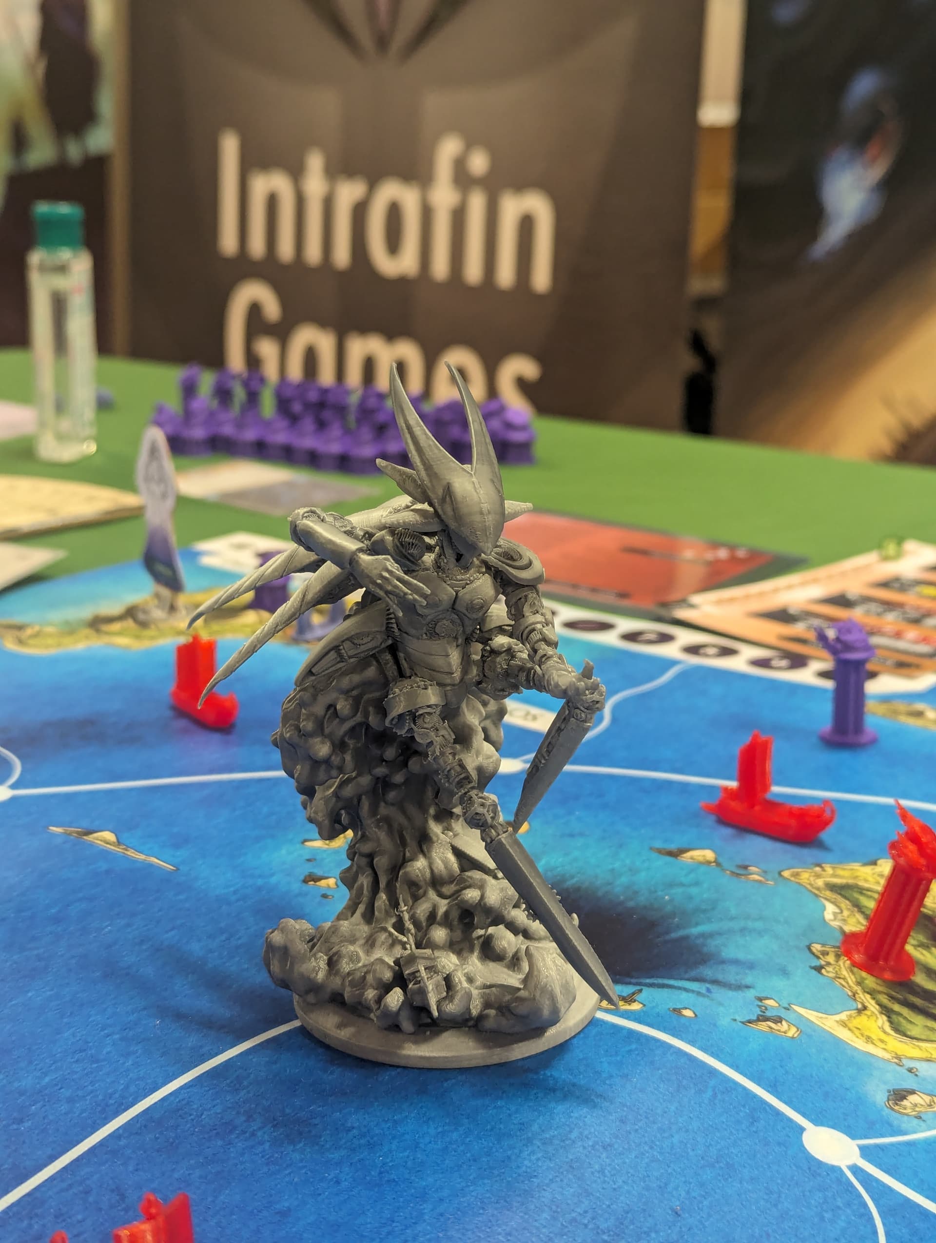 Il s’agissait d’un prototype, ce qui veut dire que ni le matériel ni les règles n’étaient en version finale (Damien a d’ailleurs ajusté en live certaines règles durant les 4 jours du festival). Le combat est maintenant plus simple et plus interactif par exemple. Les figs étaient imprimées sur une « bête » imprimante 3D à fil et pas du tout de la résine. Malgré cela elles étaient sublimes (d’après Damien, leur taille finale devrait être 10-15% plus petites). J’adorerais vous parler des mille idées géniales que Damien a eu pour le matos dans sa forme définitive mais j’ai trop peur de me faire taper (chez vous un indice en bas de votre écran : acrylique et néoprène).