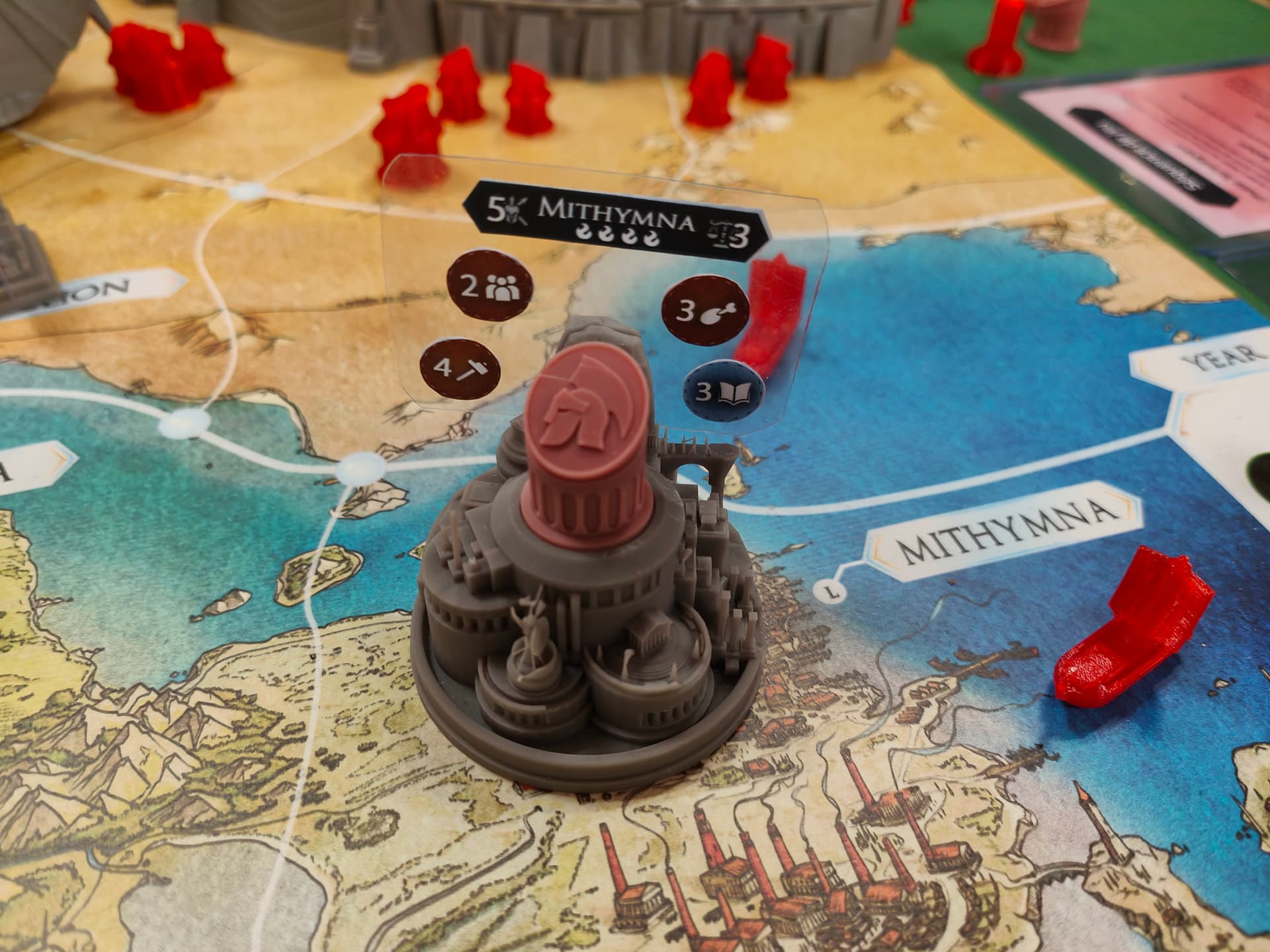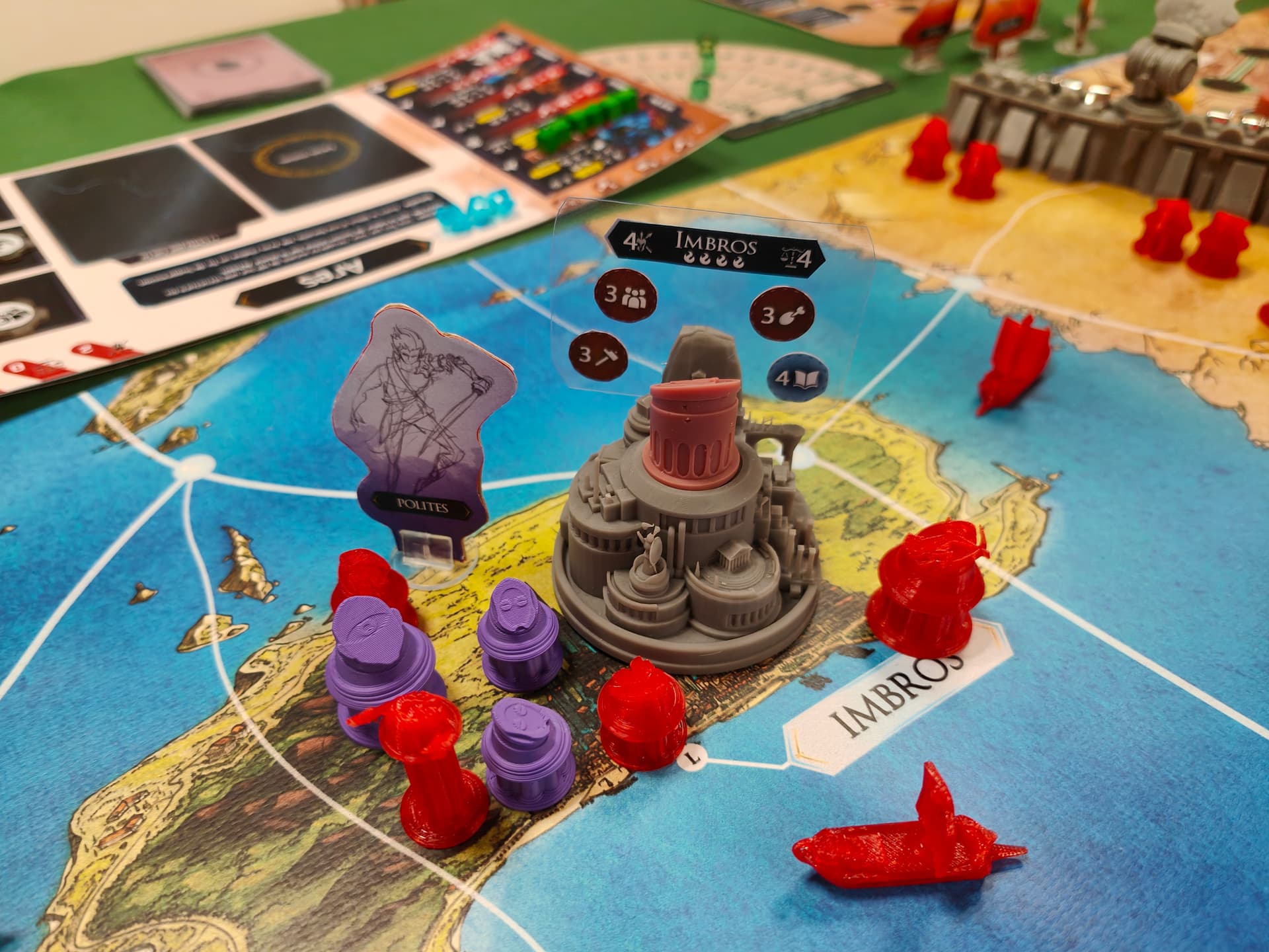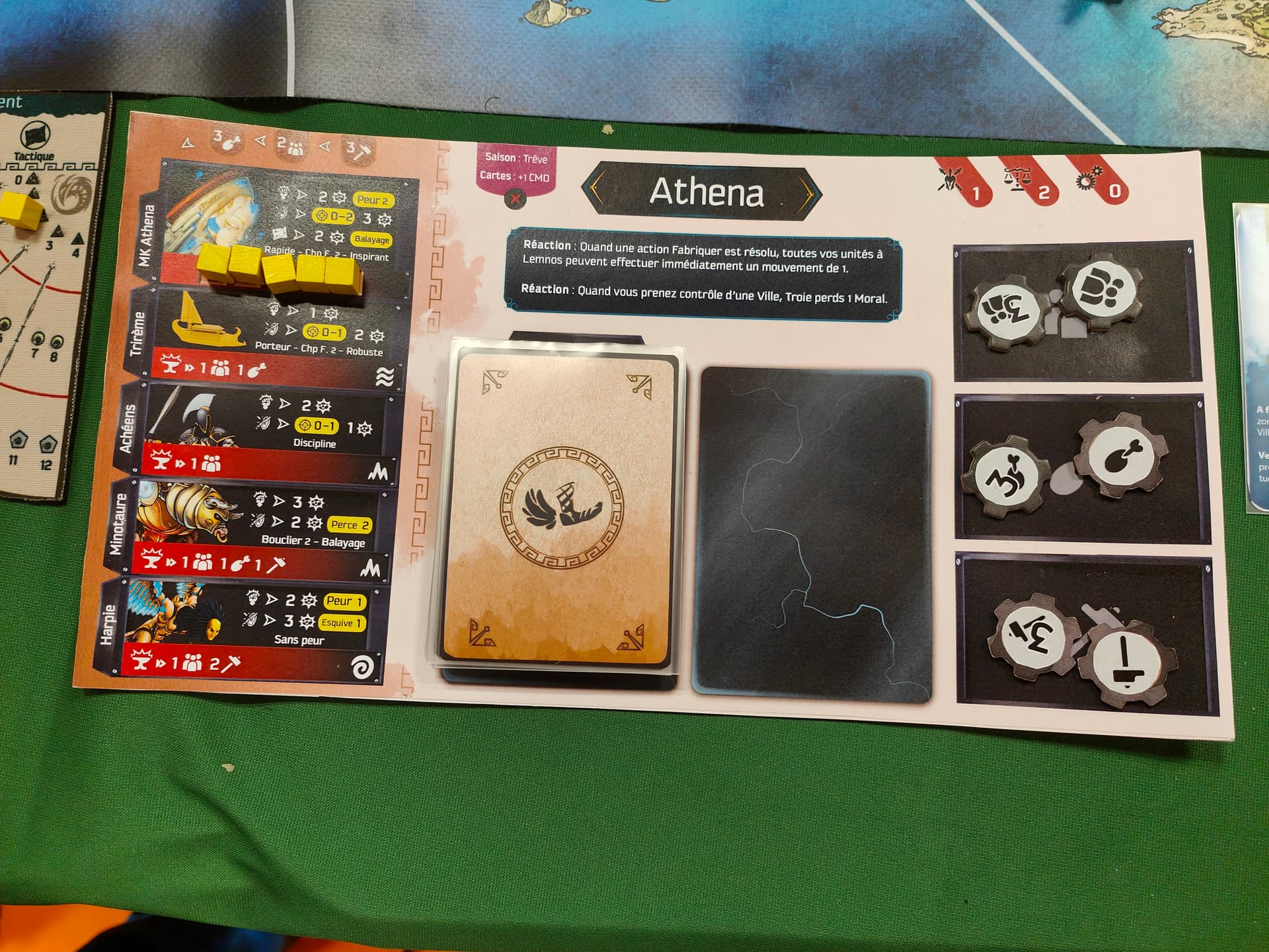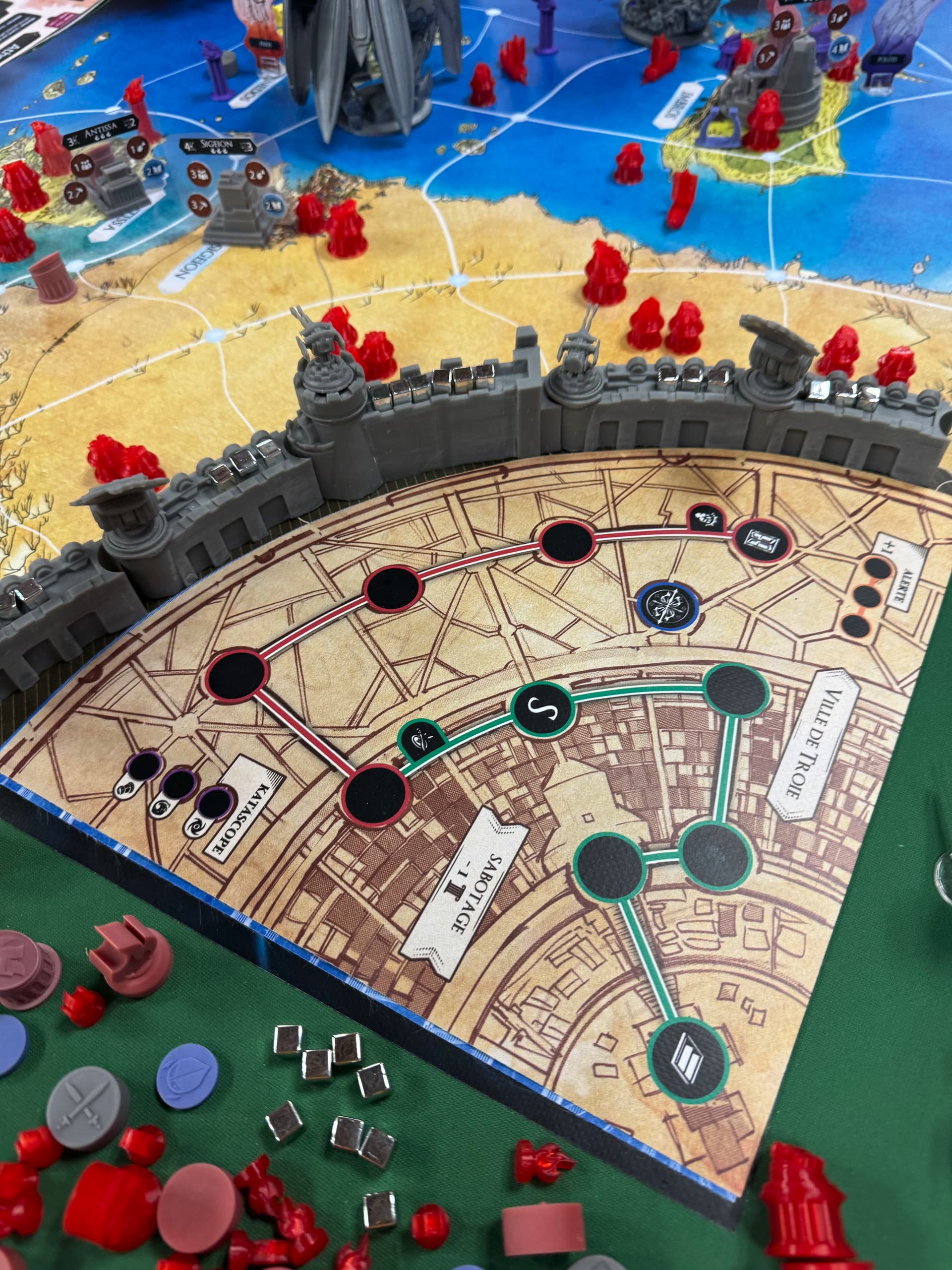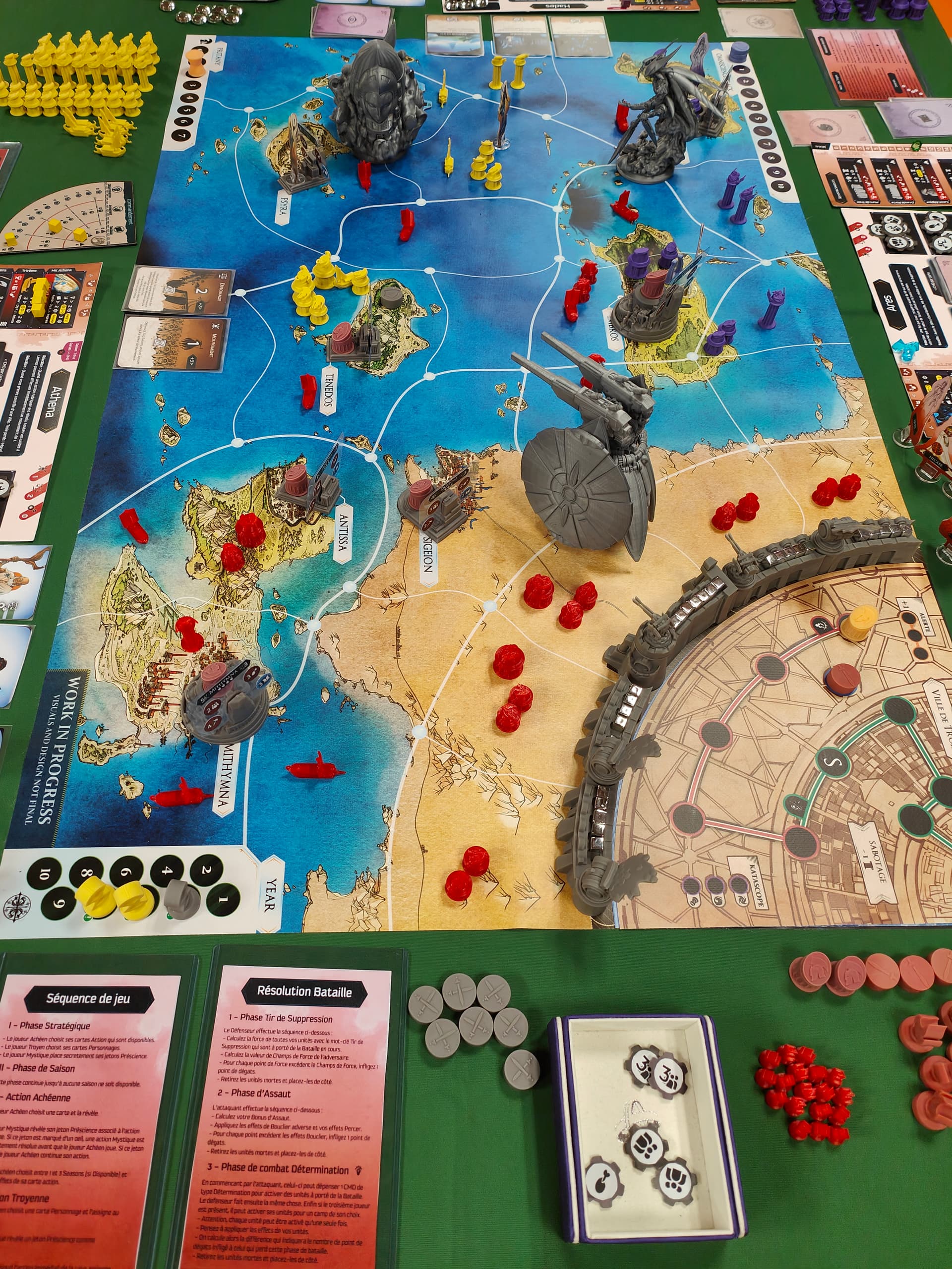 Après chaque action achéenne, le Troyen va donc envoyer un héros sur une des actions du conseil (divisées en 3 catégories, donc chaque héro n’a pas accès à toutes les actions), avoir une action « immédiate », et possiblement une action de « fin d’Age », si le héros est toujours là. Il dispose aussi de 3 aegis pour la partie, qui servent de joker, permettant de faire une 2eme fois une action déjà effectuée (dont le siège au conseil est occupé).