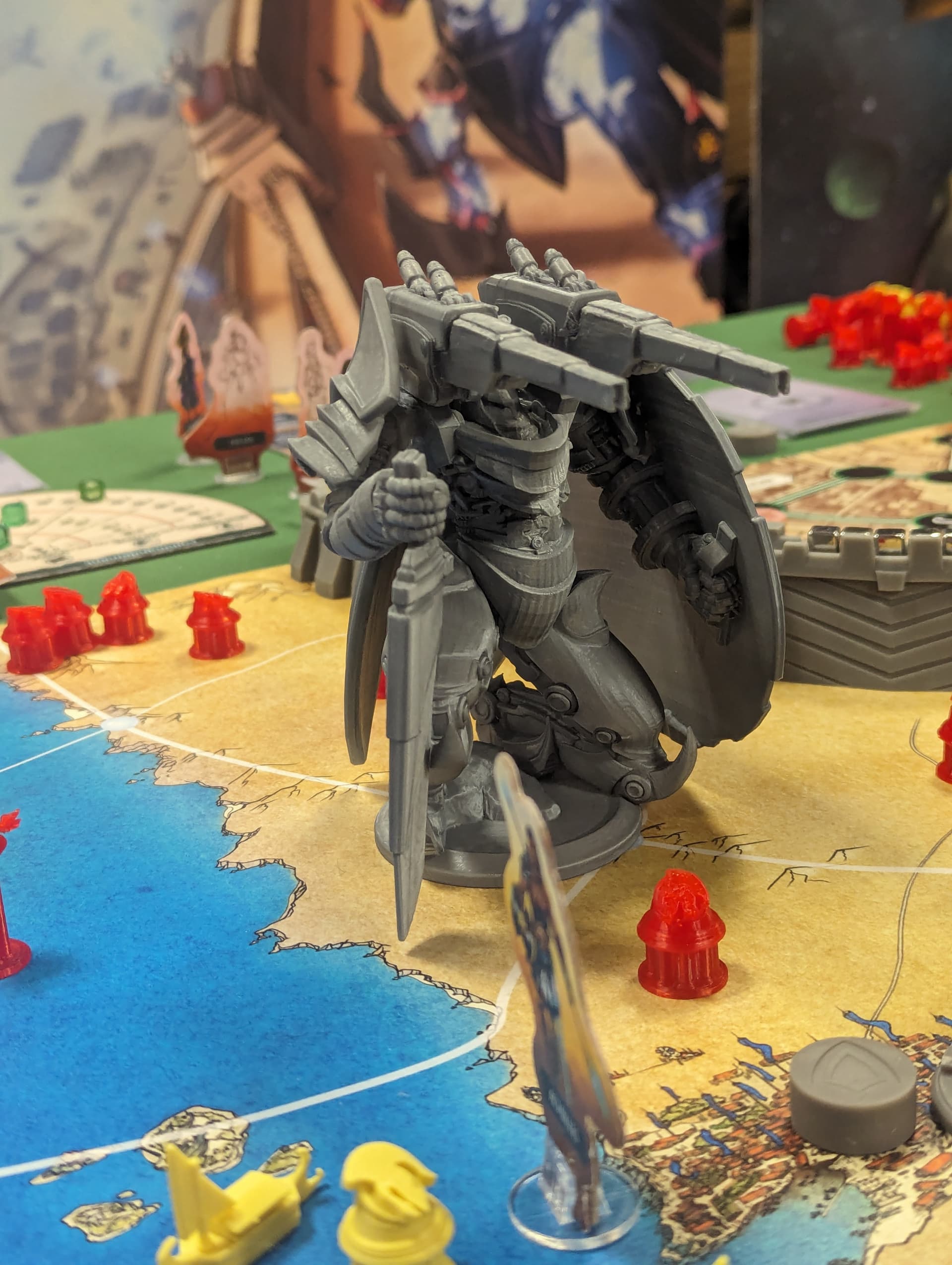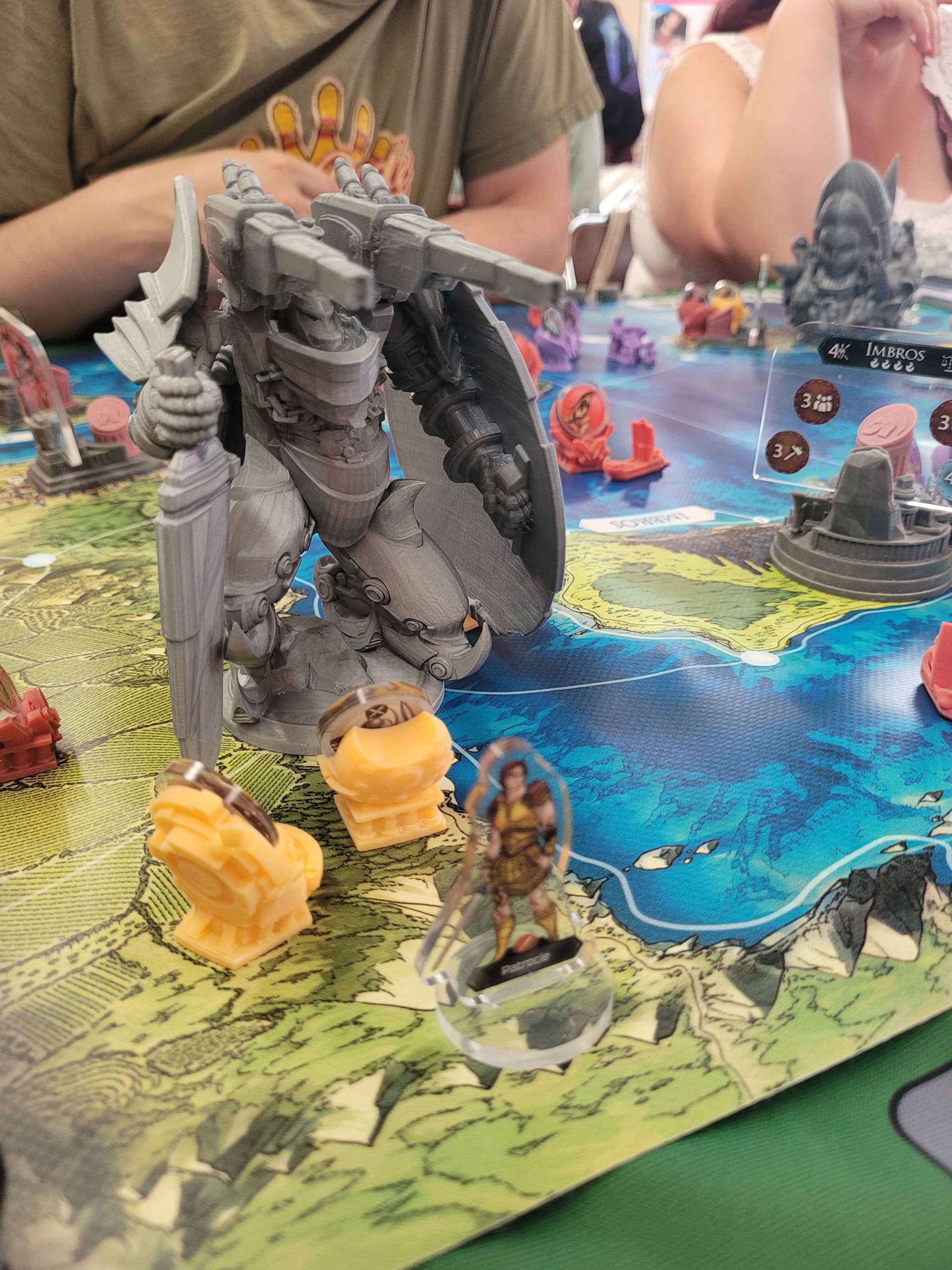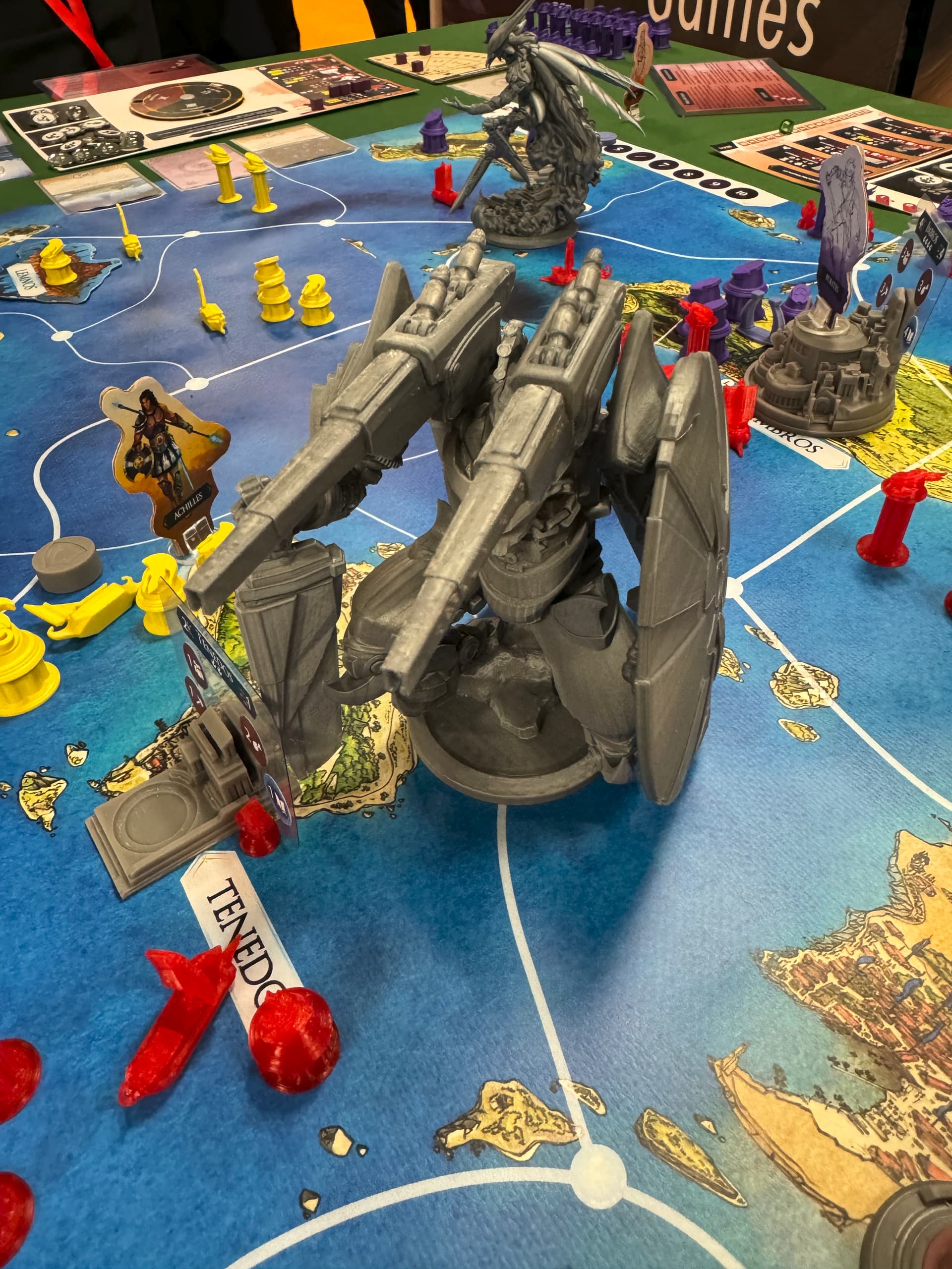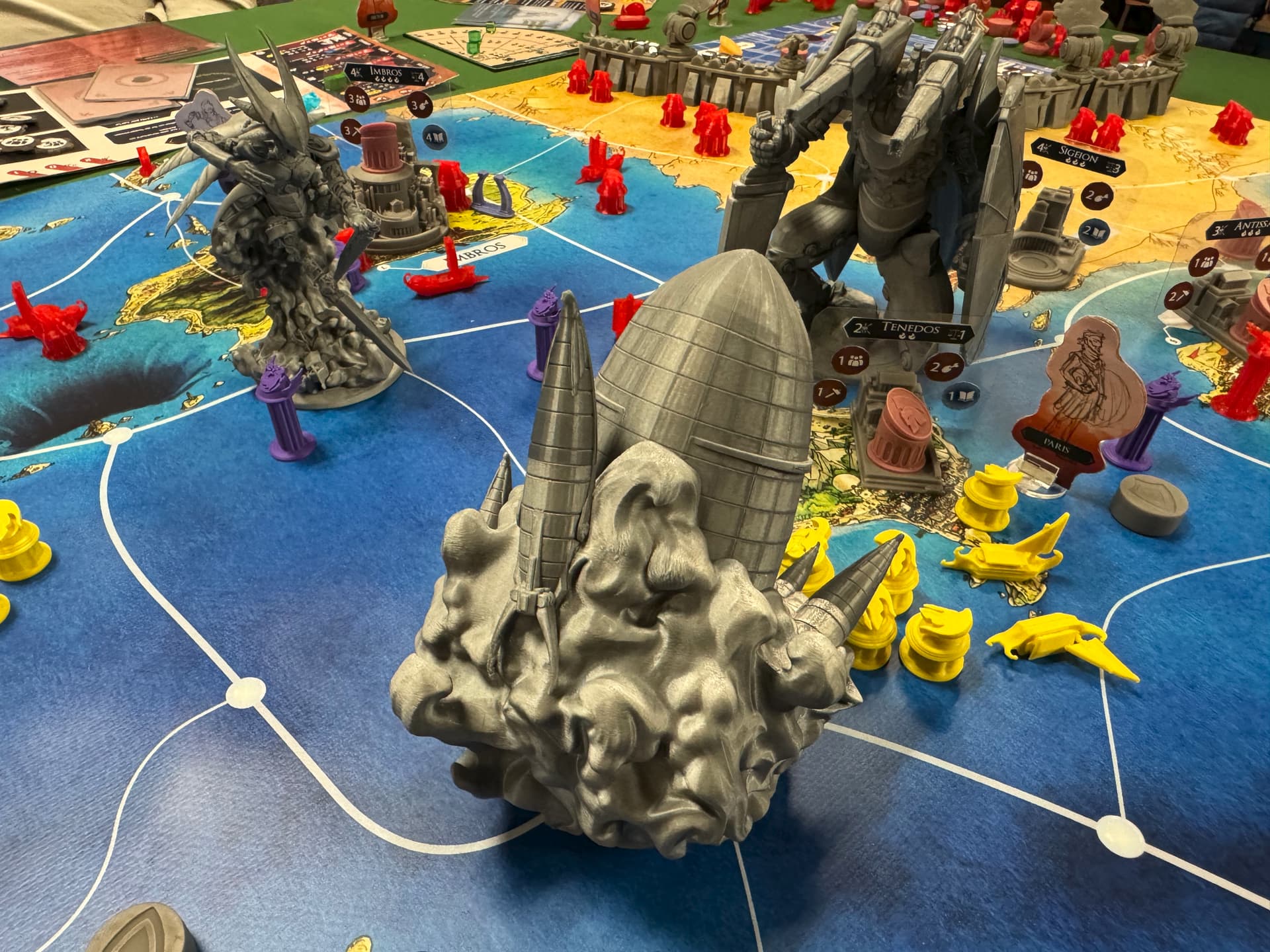 Ce sont les Olympiens, chacun dans son armure MK (Hadès et sa classe galactique chez les Mystiques, Arès et son Gundam chez les Troyens et Athéna et son dirigeable lanceur de missiles chez les Achéens. Elles sont tellement plus grandes/imposantes que les troupes mortelles qu’on ne les place pas dans les zones mais à leur intersection (ce qui veut dire que votre Mecha est présent simultanément dans 3 ou 4 zones et ça permet plein de combo car ils apportent souvent de gros bonus à vos actions, qu’elles soient militaires, politiques ou économiques.