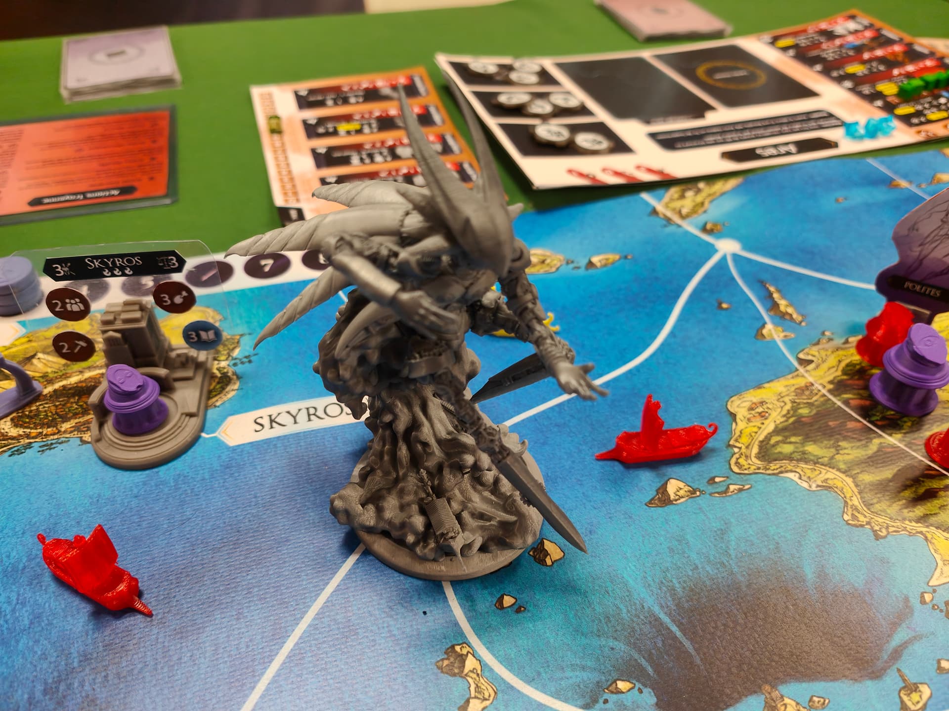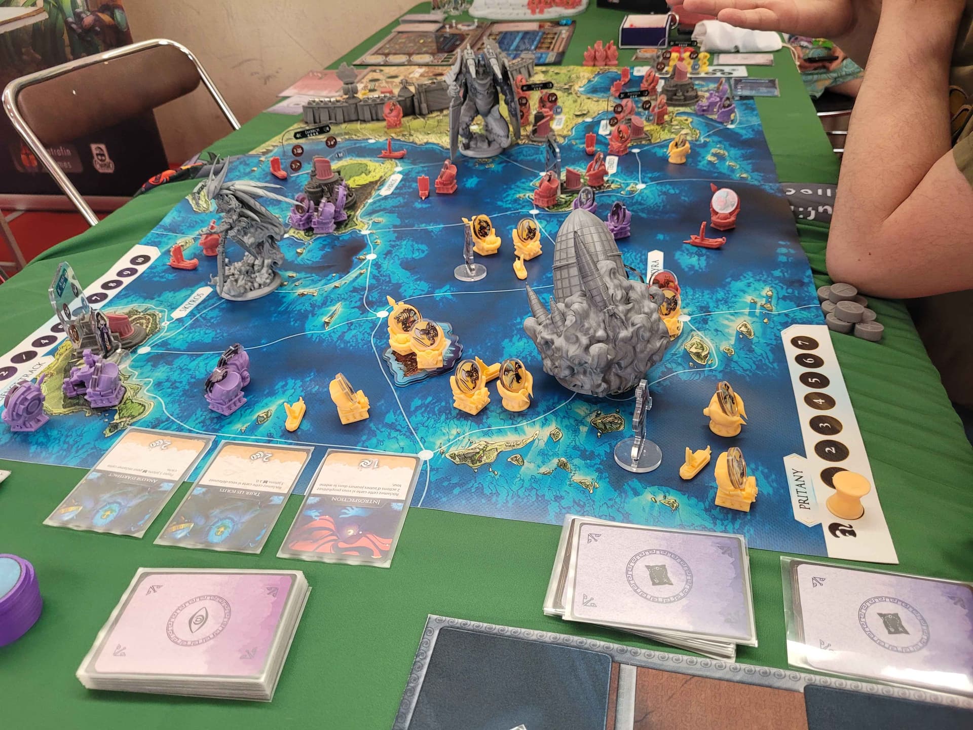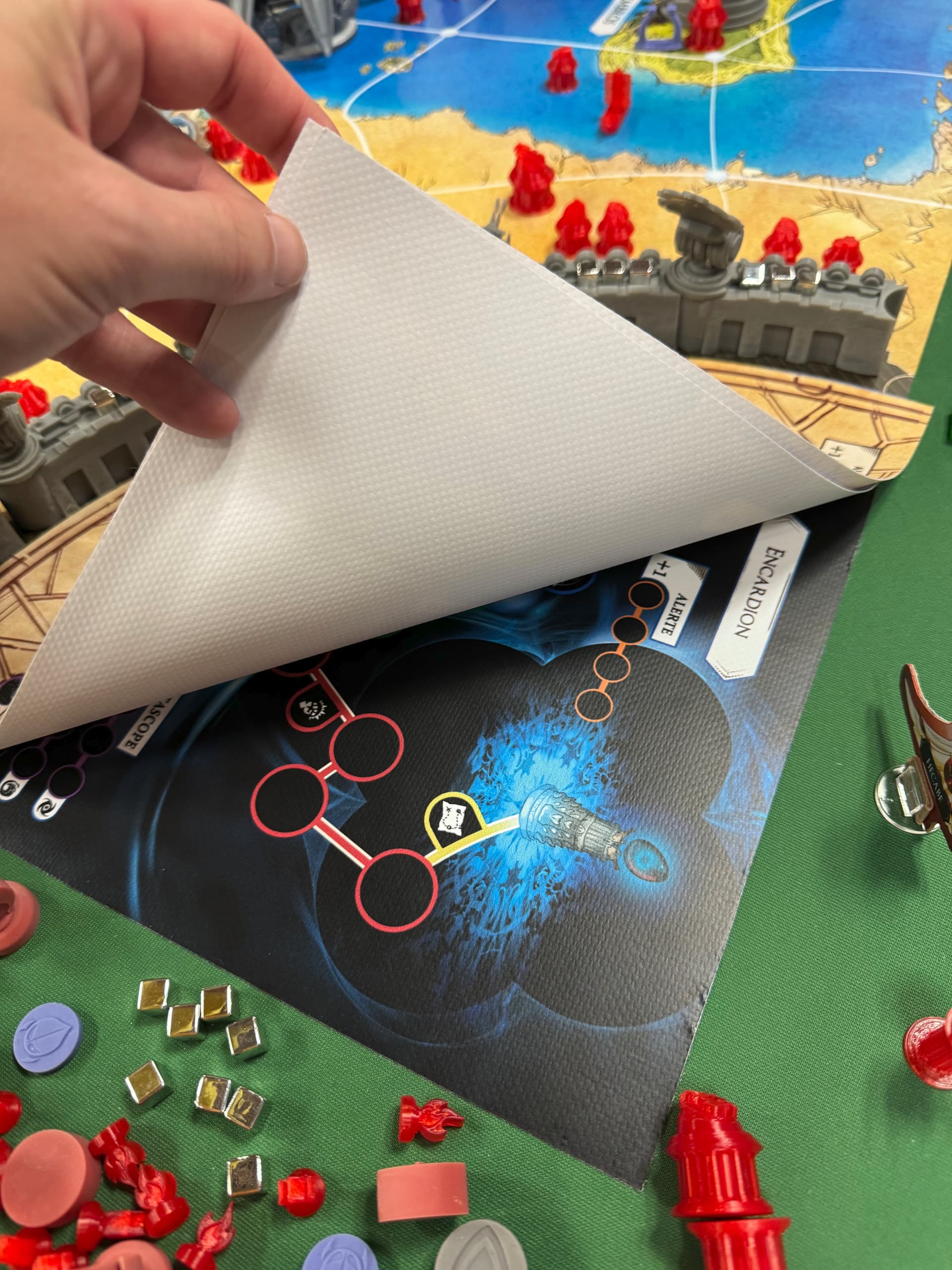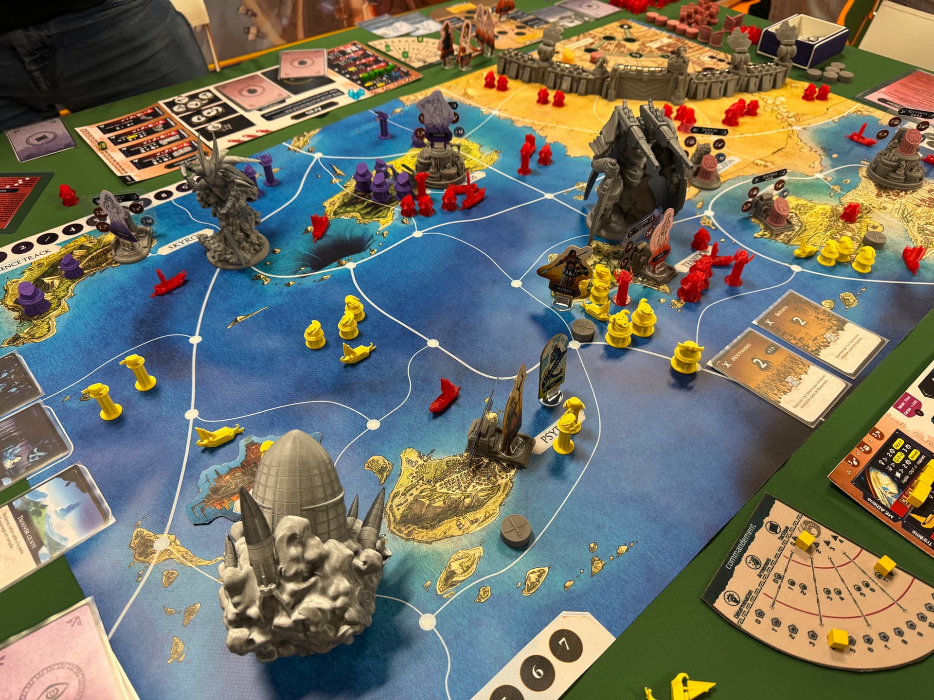 Dis comme ça cela pourrait ressembler à une faction qui n’a pas d’interaction avec les deux autres mais que nenni, grâce aux contrats ! En effet les deux autres factions peuvent demander de l’aide aux Mystiques (ex : laisse-moi utiliser tes super arches de téléportation, prêtes-moi des troupes, etc…) en échange d’à peu prêt n’importe quoi de négociable (des ressources, pouvoir tirer de nouvelles cartes Vision…). Et là vous me direz « ils jouent quand les Mystiques ? Ils récupèrent le temps investi par les Achéens ? » et bien la réponse va vous surprendre : les Mystiques ne jouent pas pendant les tours « normaux ».