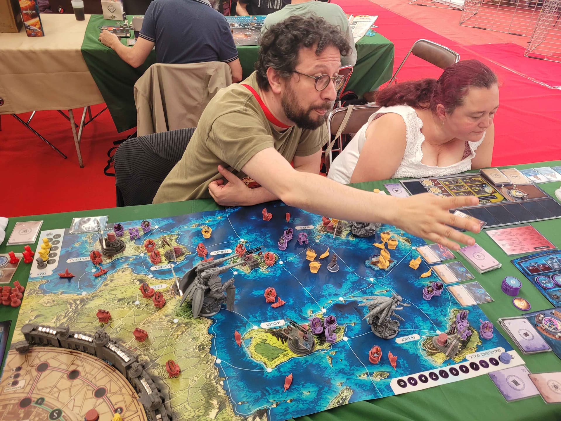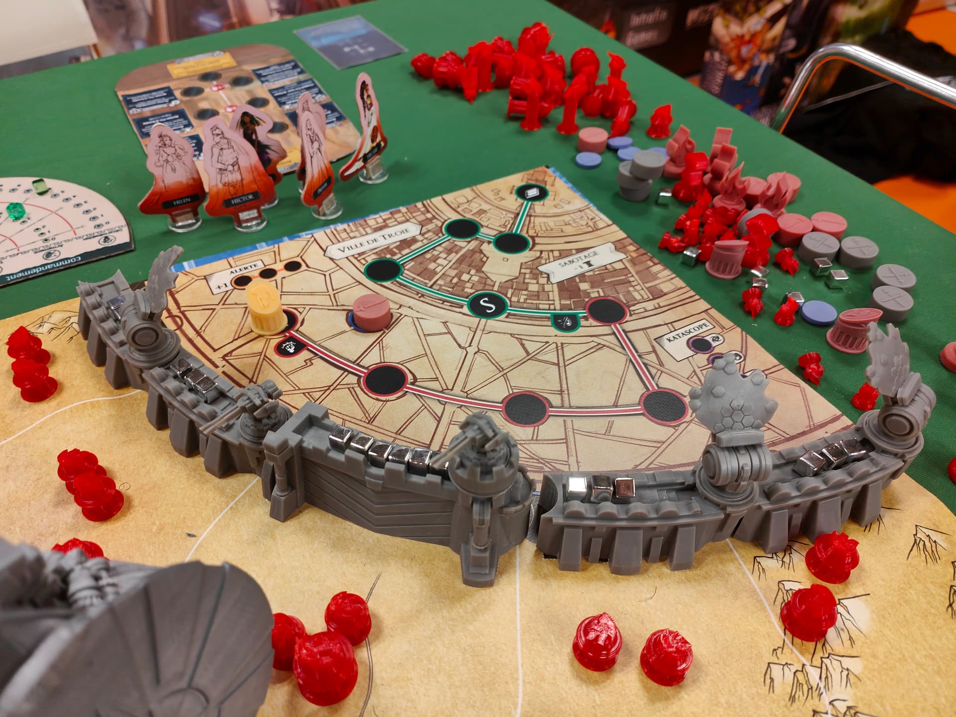 Les démonstrations ne duraient que deux tours de jeu (alors que la piste compte-tours semble monter au moins à 10, j’ai pas vérifié le chiffre exact). Chose maligne, on commençait directement au tour 6 ou 7, ce qui veut dire que la partie démarrait avec un certain nombre d’éléments déjà en jeu ou débloqués (parfait pour être directement dans l’action).